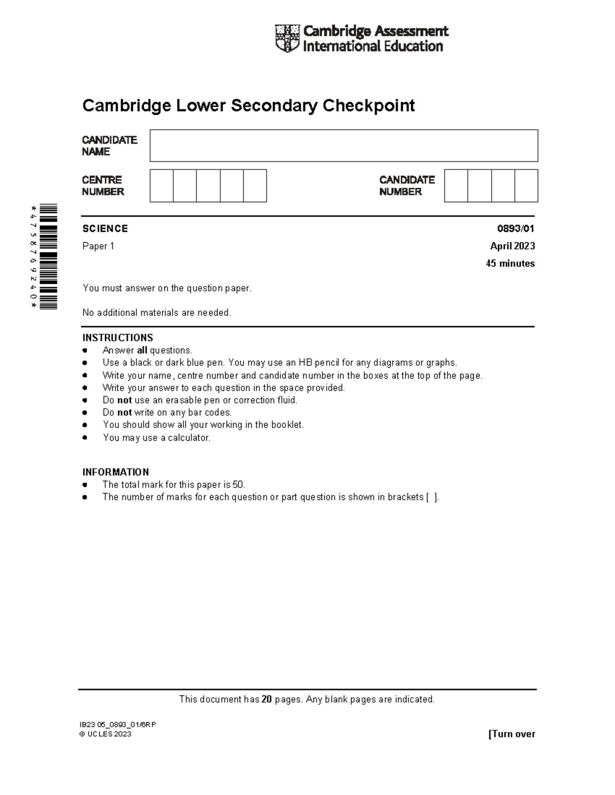 Cambridge Lower Secondary Checkpoint SCIENCE Paper 1 - April 2023 Exam ...