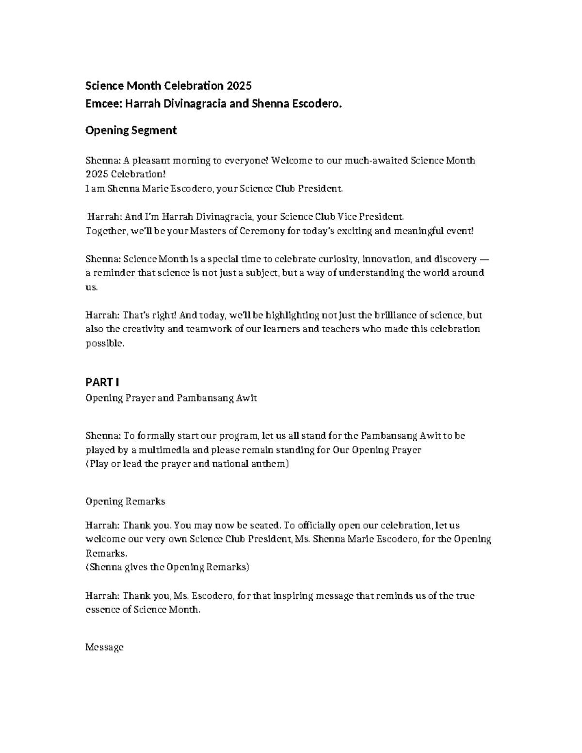 Script- Emcee (SCI-MATH) 085331 - Science Month Celebration Opening and ...