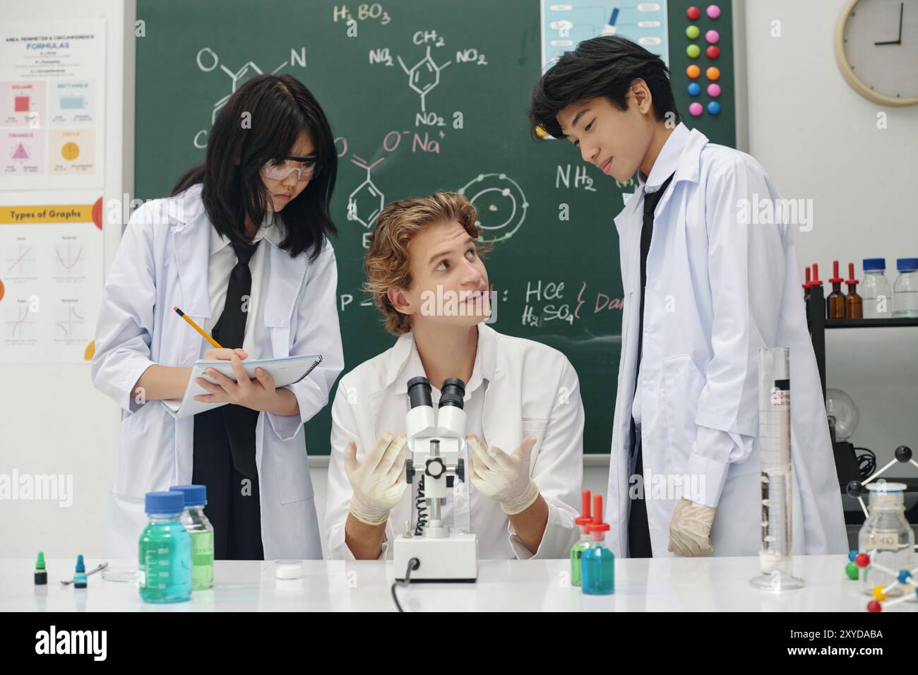 Discussing Chemistry Project in Classroom Laboratory Stock Photo - Alamy