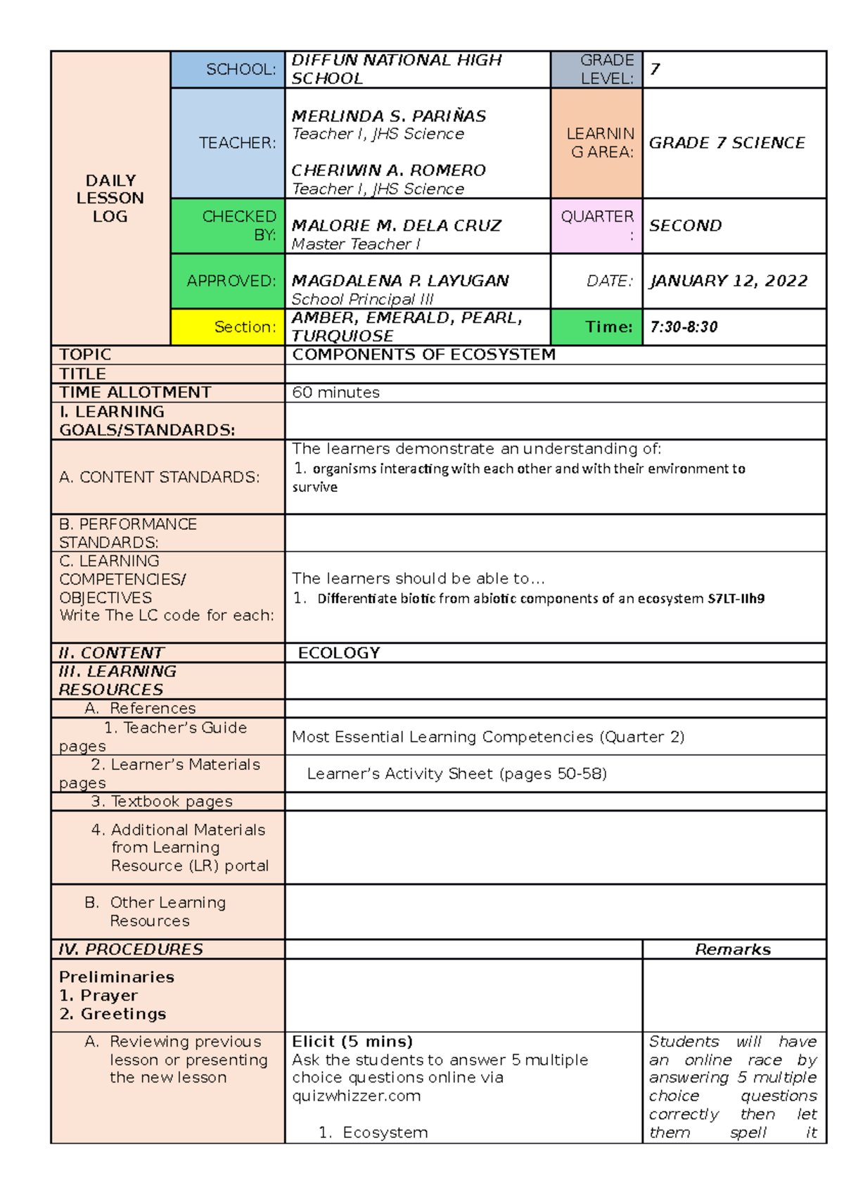 Science 7-LP, Q2 - document - DAILY LESSON LOG SCHOOL: DIFFUN NATIONAL ...