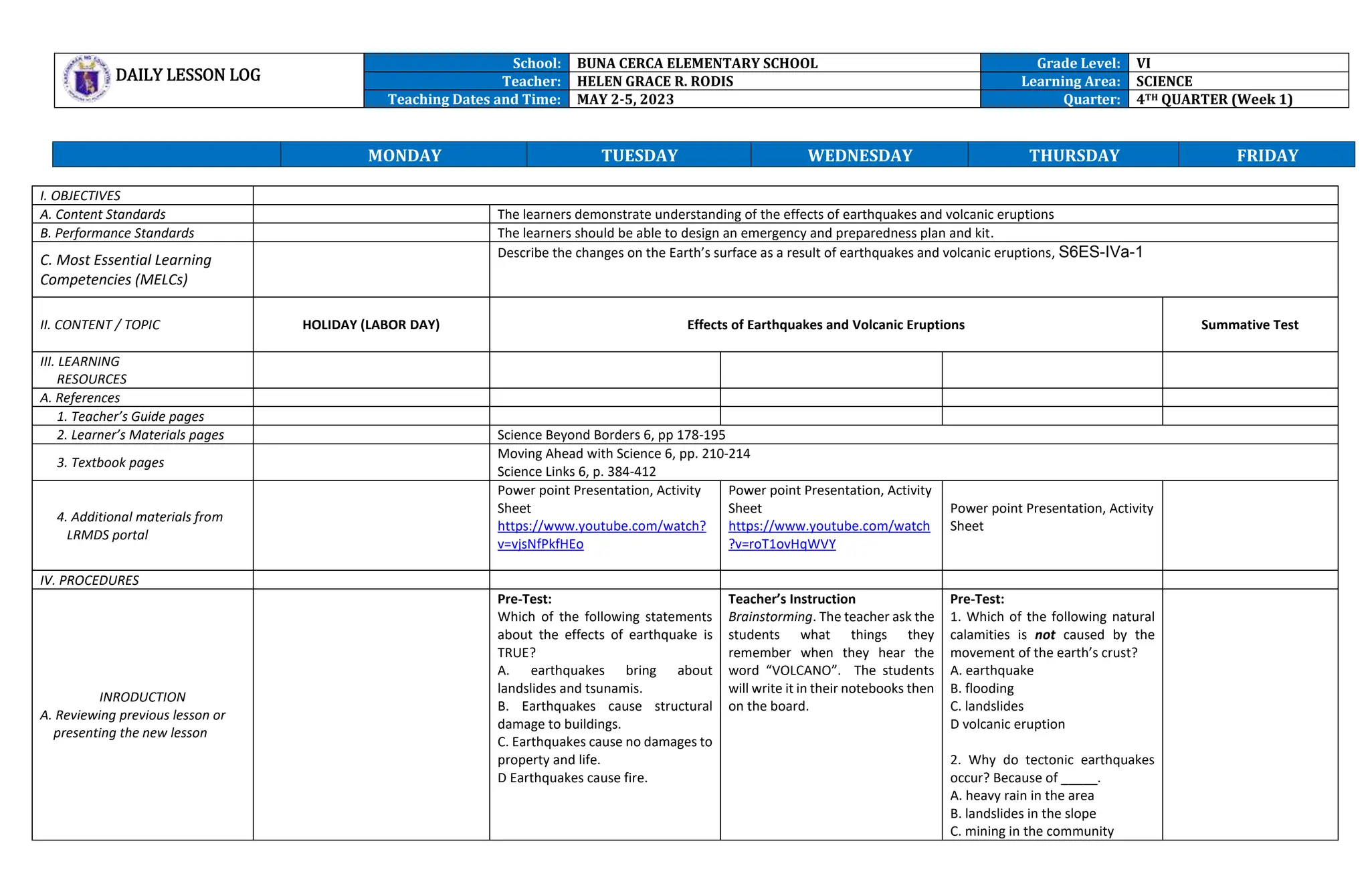 Science W4 - Daily lesson log sample - DAILY LESSON LOG School: Grade ...