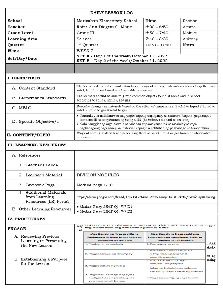 Daily Lesson Log: Science 3 Q1 W1 - Sorting Solids, Liquids, Gases ...