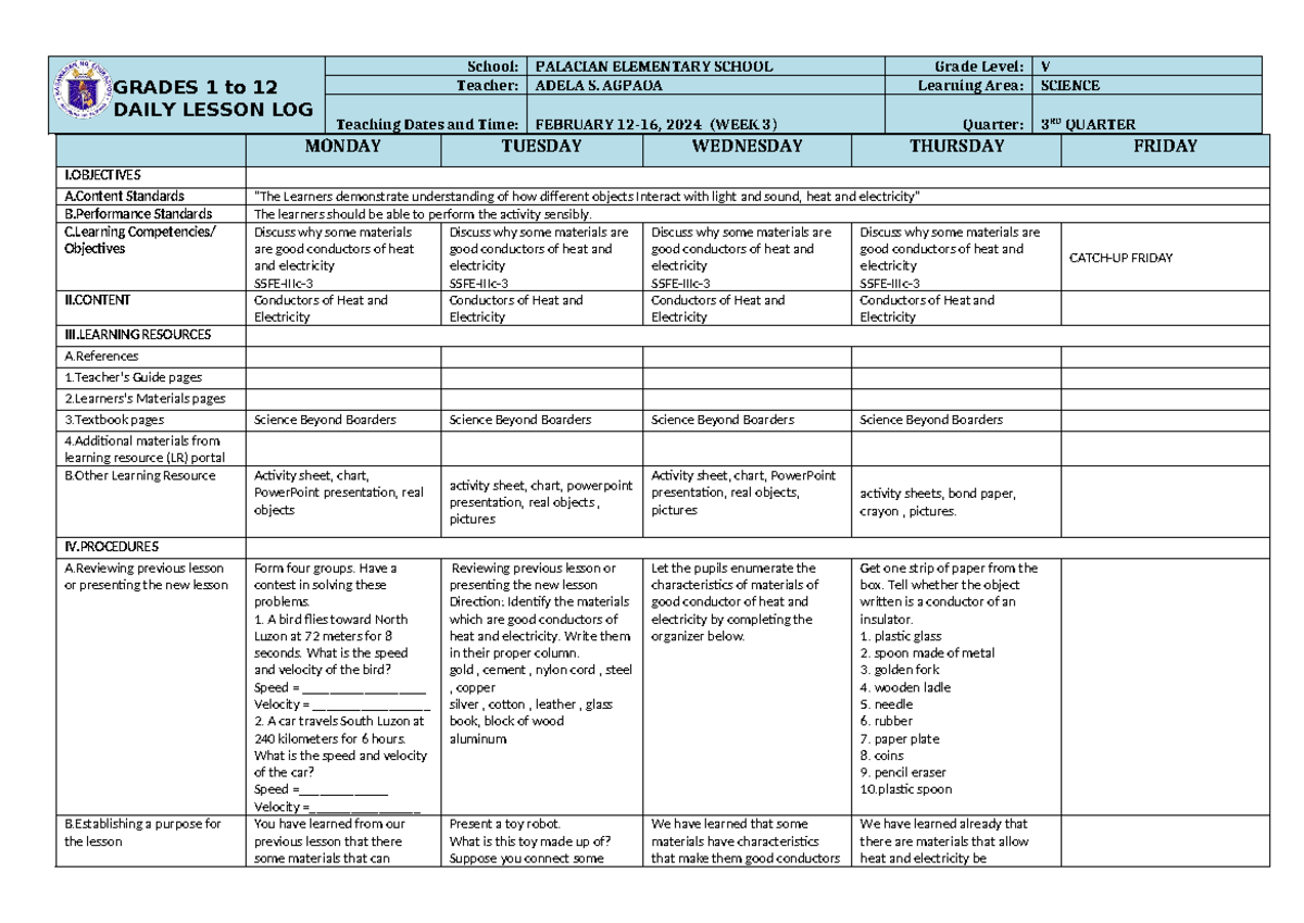Science 5 Q3 W3 Daily Log Lesson - GRADES 1 to 12 DAILY LESSON LOG ...