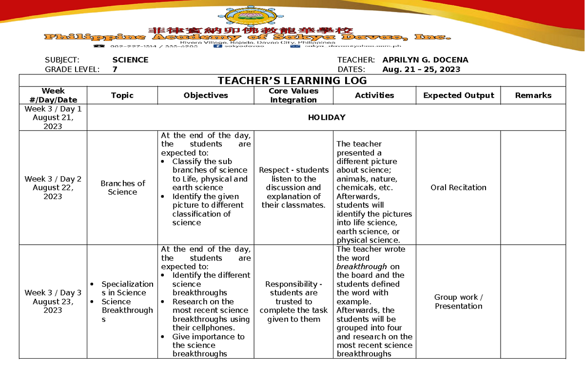 Science - This is a sample daily lesson log for one week. This will ...
