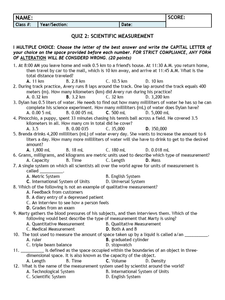 Metric Measurement Quiz Answer Key at Gwen Mayer blog