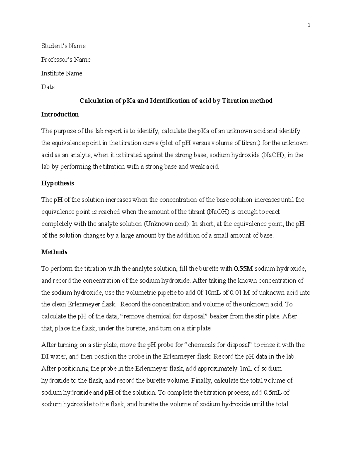 Lab Report for Calculation of pKa - 1 Student’s Name Professor’s Name ...