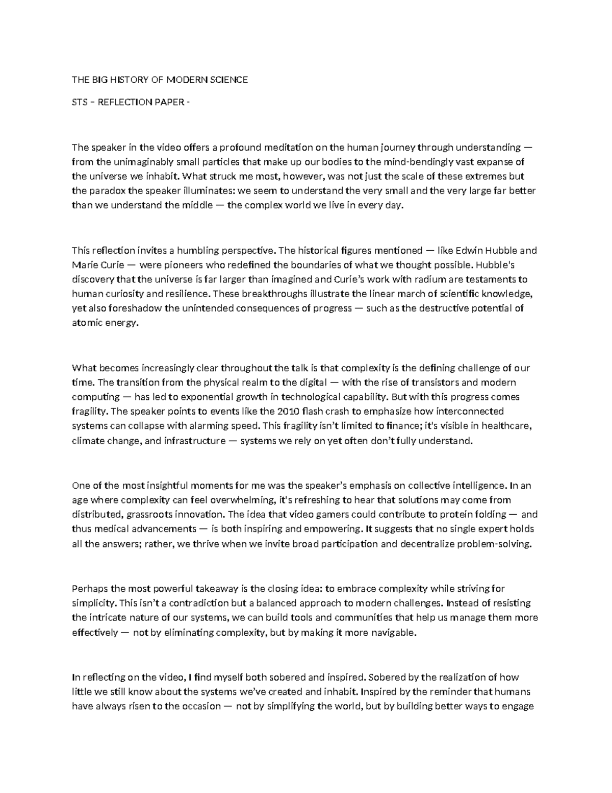 STS 301 - Reflection Paper on The Big History of Modern Science - Studocu