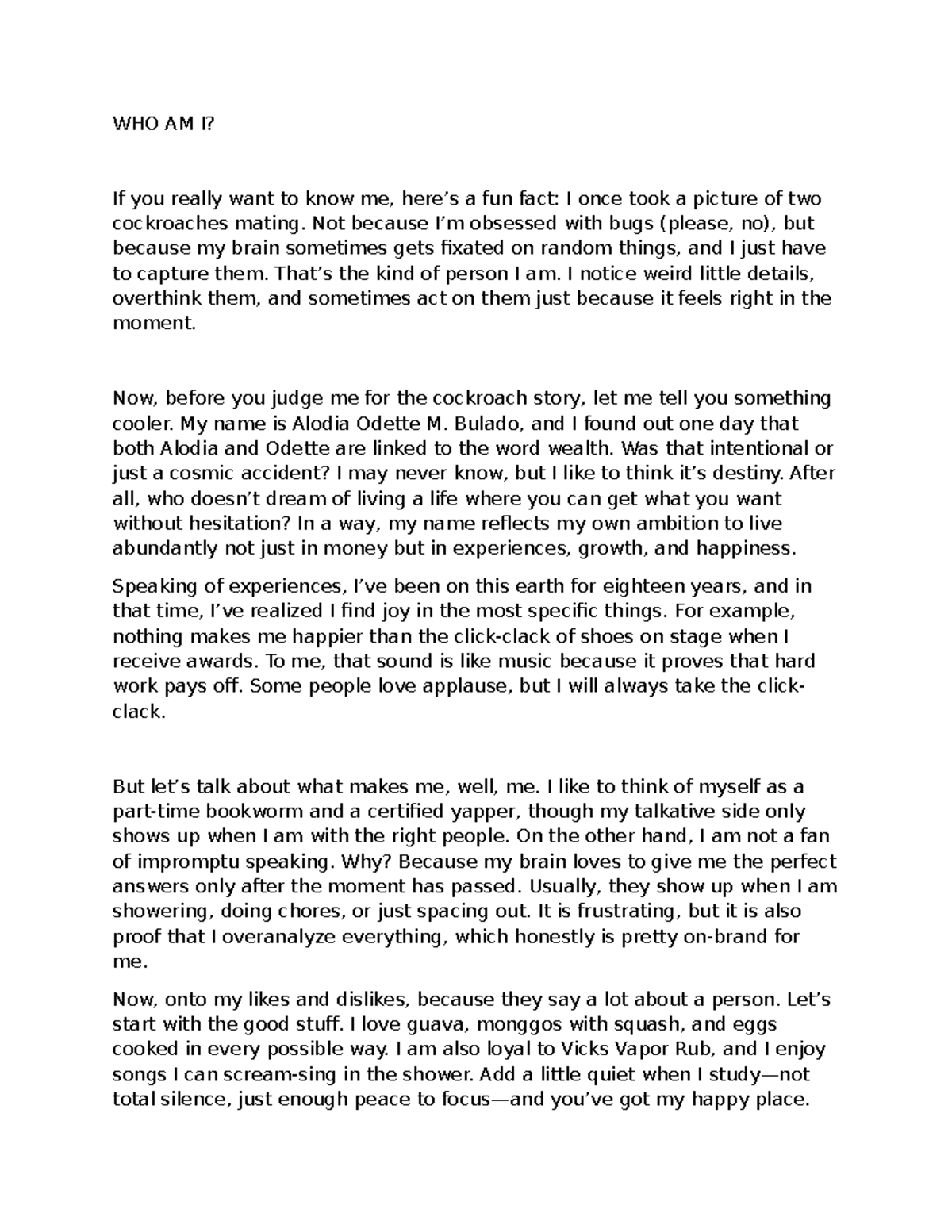 Self-Reflection Essay: Who Am I? - Alodia Odette M. Bulado - Studocu