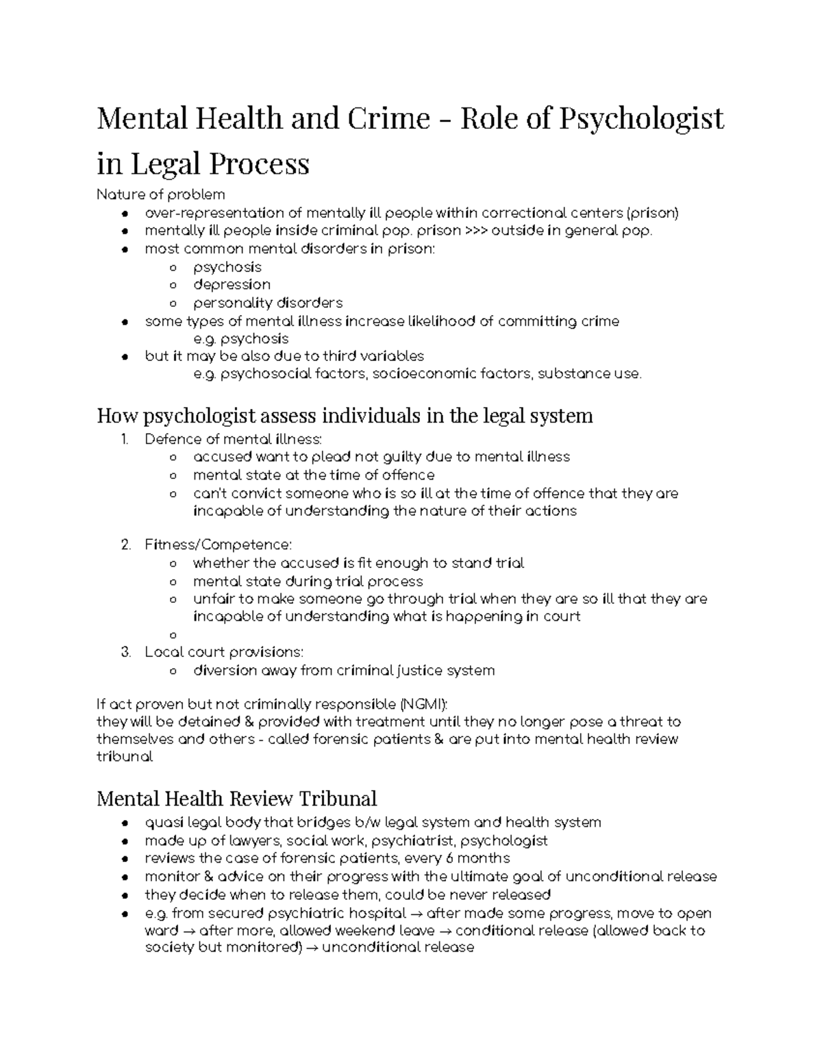 PSYC1027 - Lecture Notes Week 4 - Mental Health and Crime - Role of ...