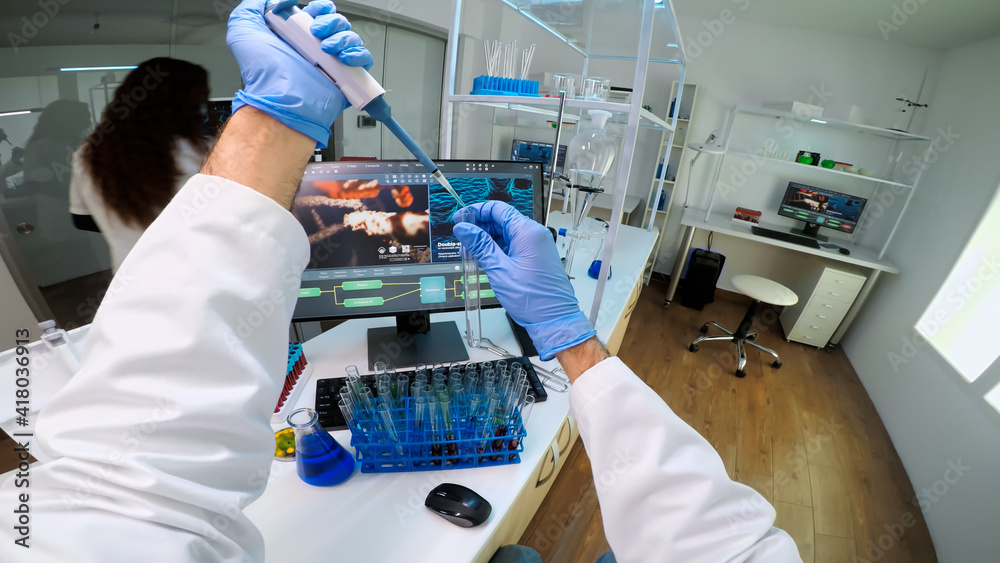 POV of scientist using micropipette in lab to extract blue liquide from ...