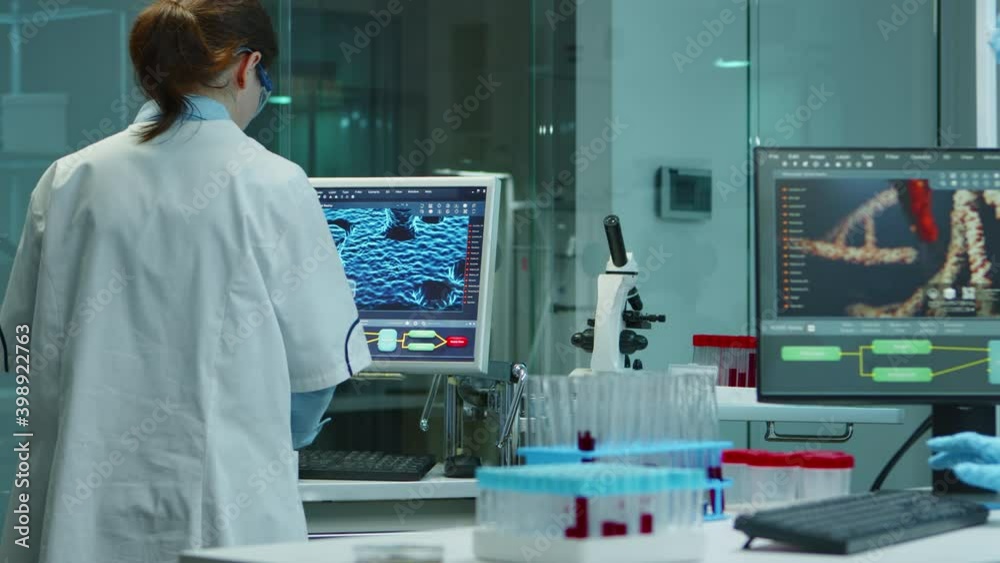 Scientist nurse typing medical reports on computer in scientific modern ...