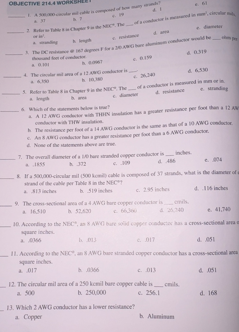 Solved: OBJECTIVE 214.4 WORKSHEE d. 1 1. A 500,000-circular mil cable ...