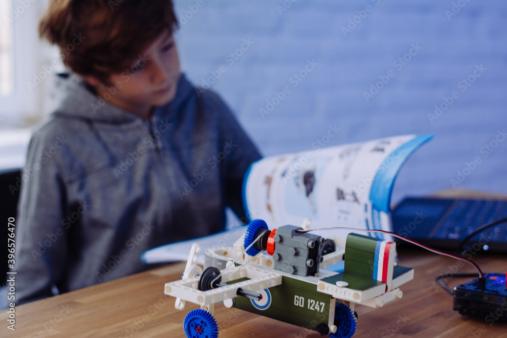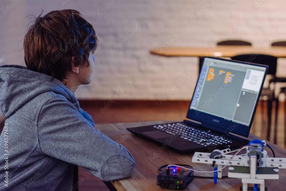 The boy is programming on a laptop. Scratch robot programming. Gigo ...