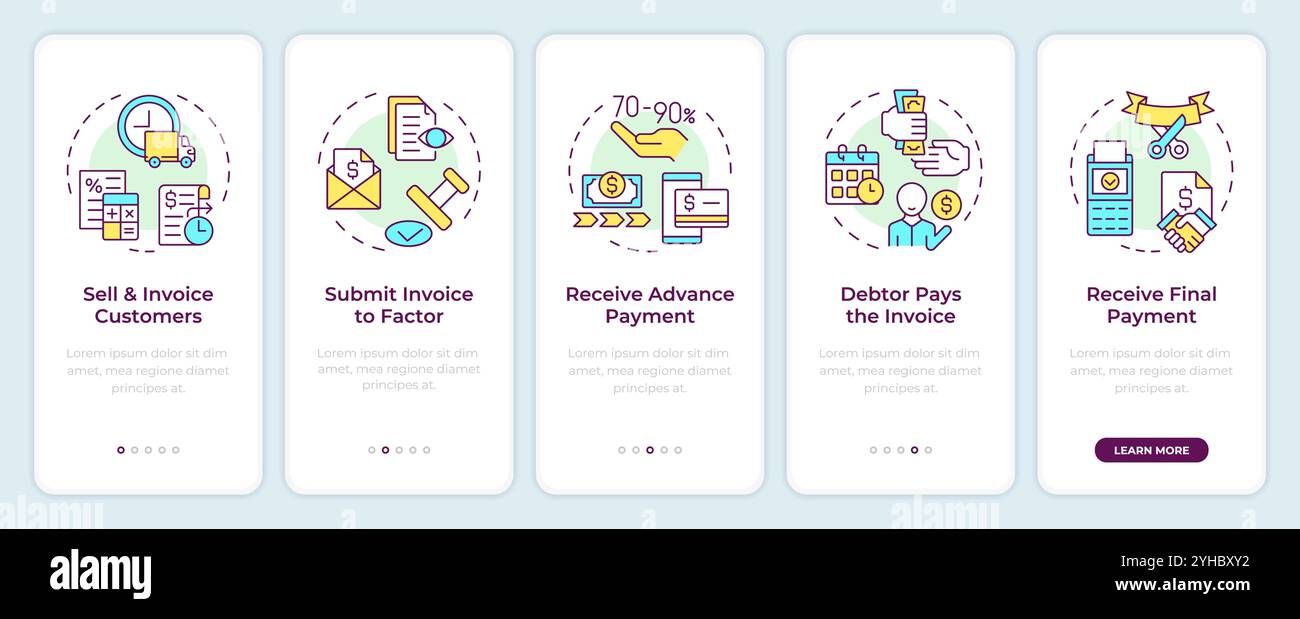 Factoring process phases onboarding mobile app screen Stock Vector ...