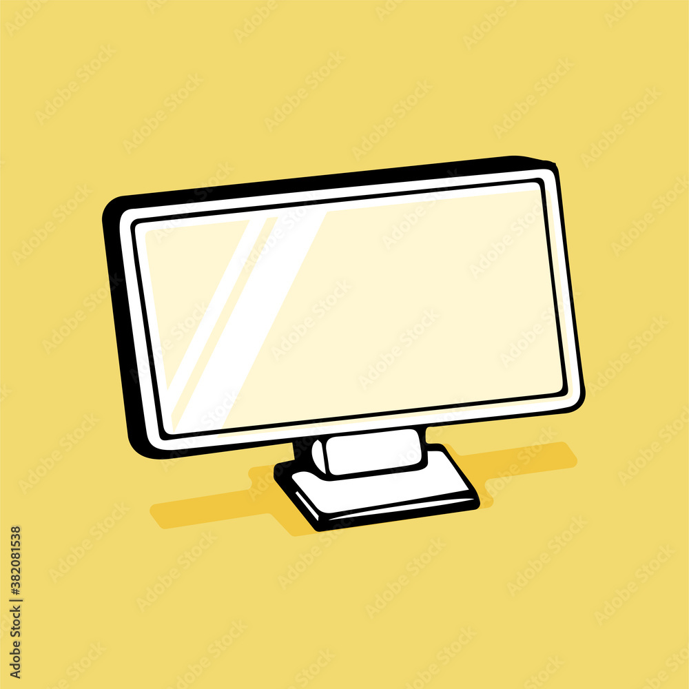 A cartoon style illustration of a desktop computer monitor with a blue ...