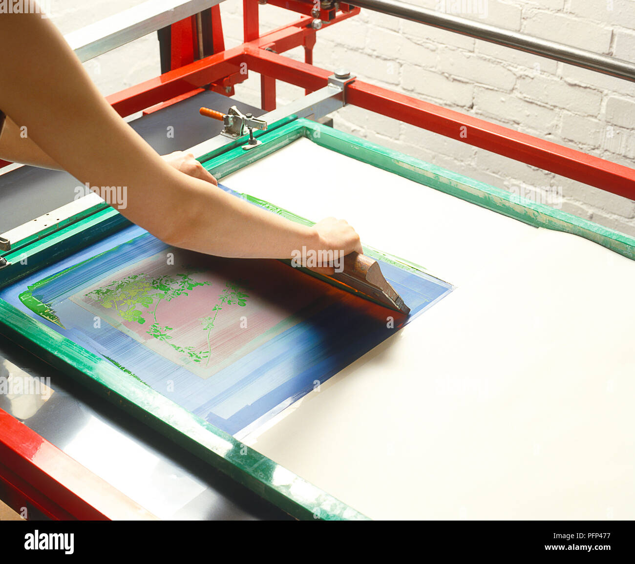 Pulling squeegee across stencil to create screenprint Stock Photo - Alamy