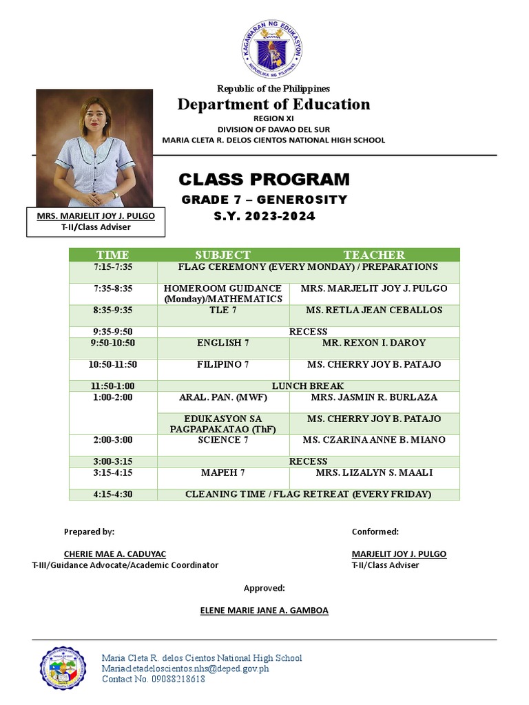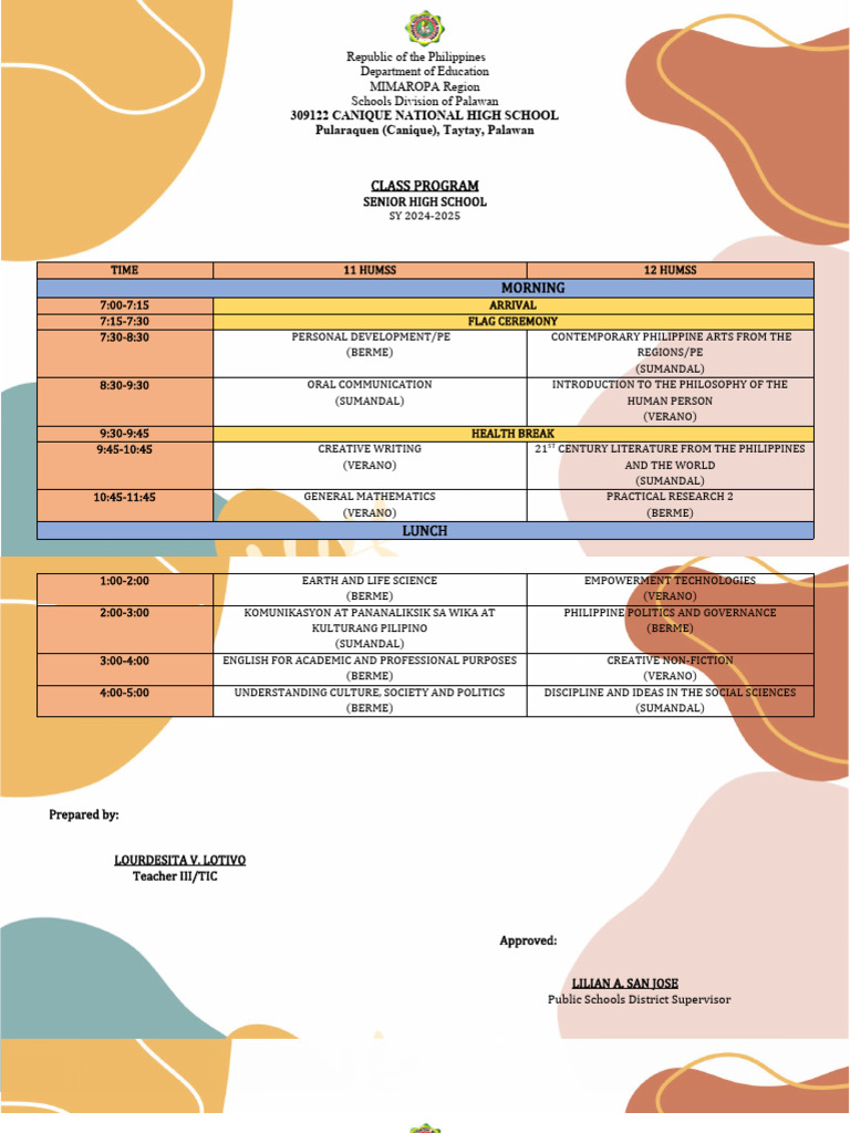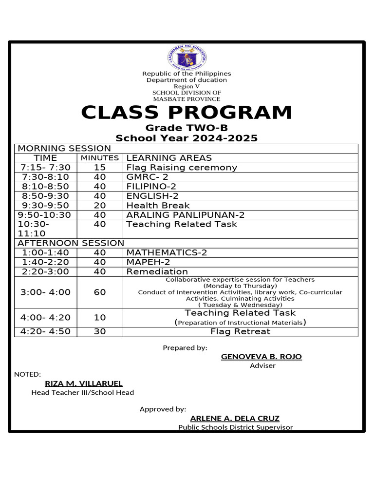 Jose Sanvictores Sr. National School: Class Program | PDF