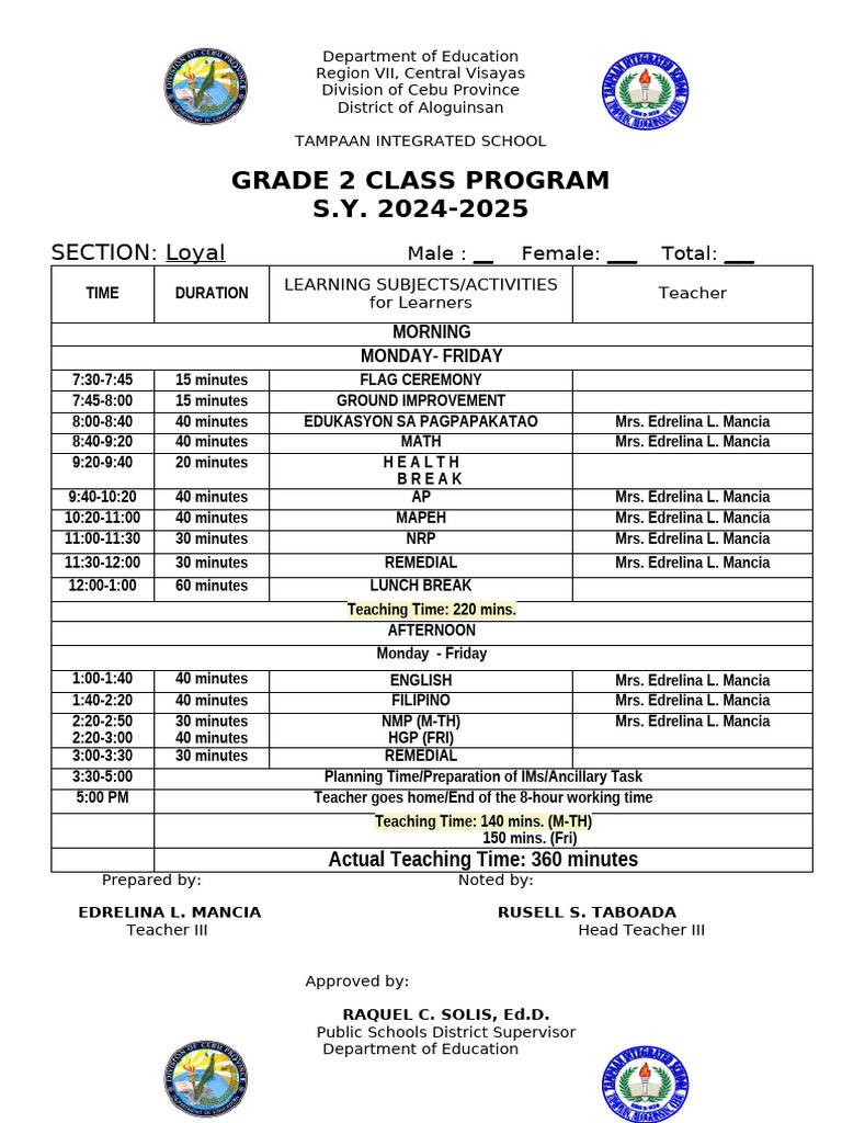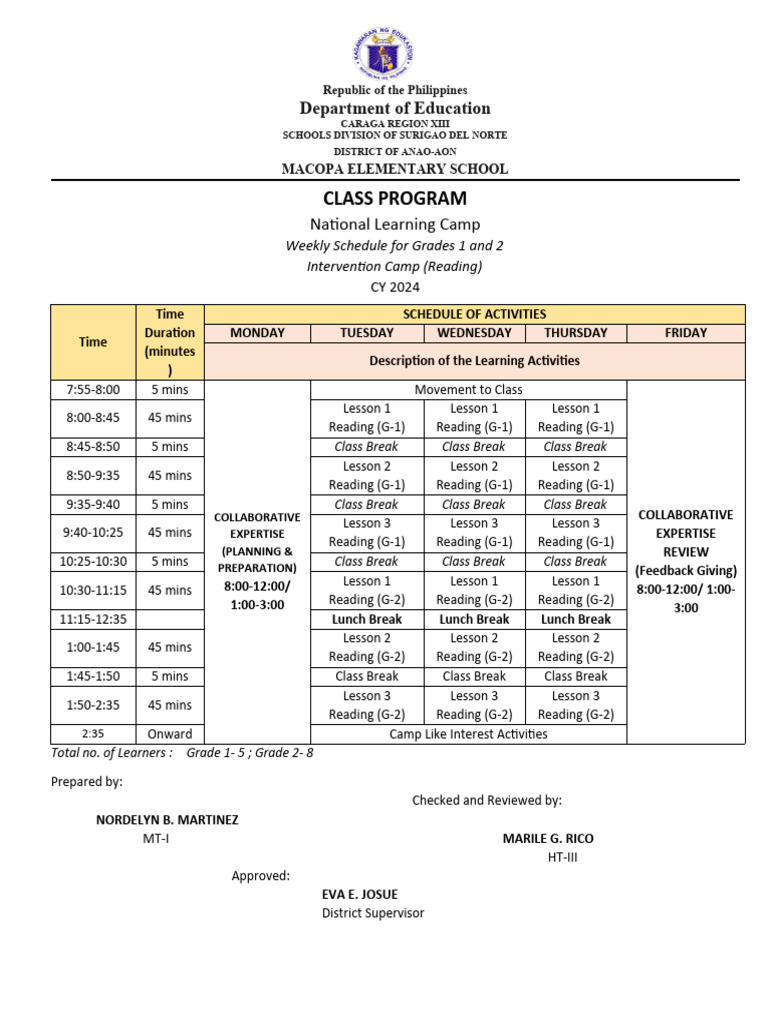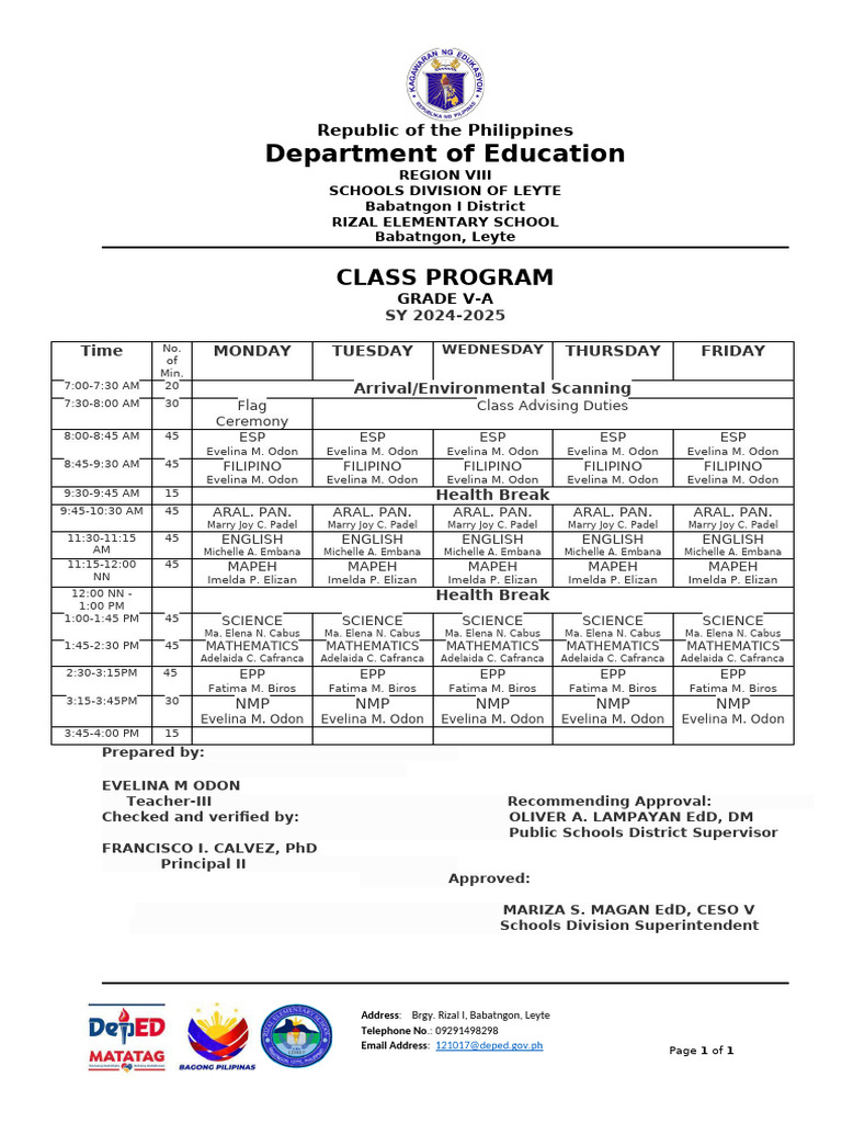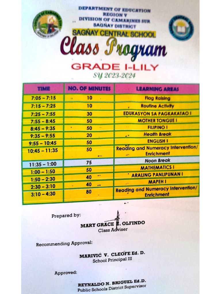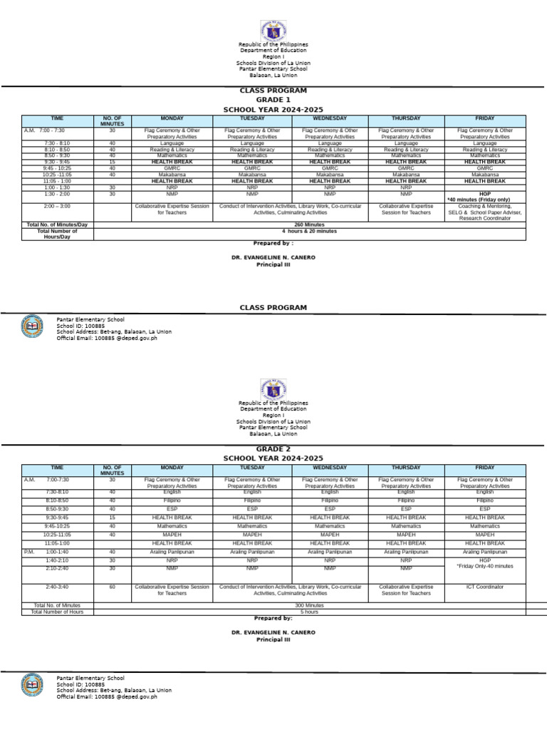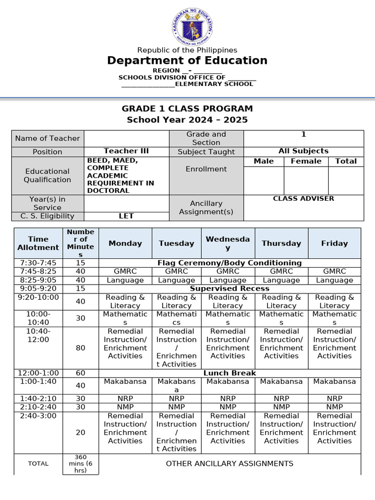 Sample Class Program For Grade 1 SY 2024 2025 | PDF