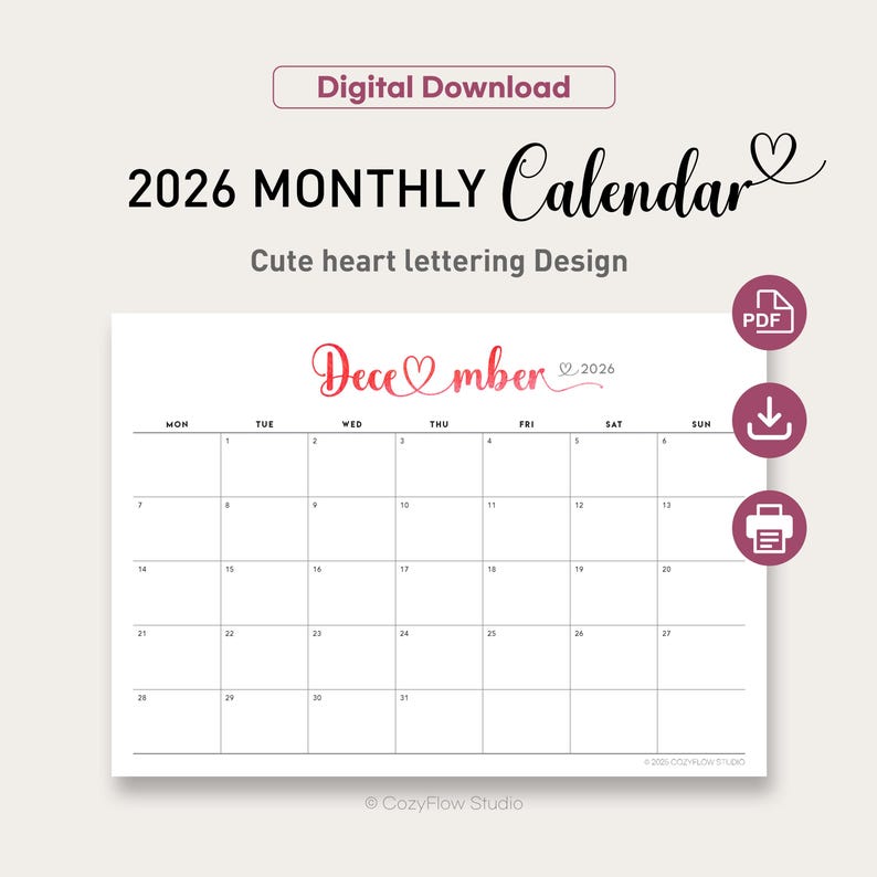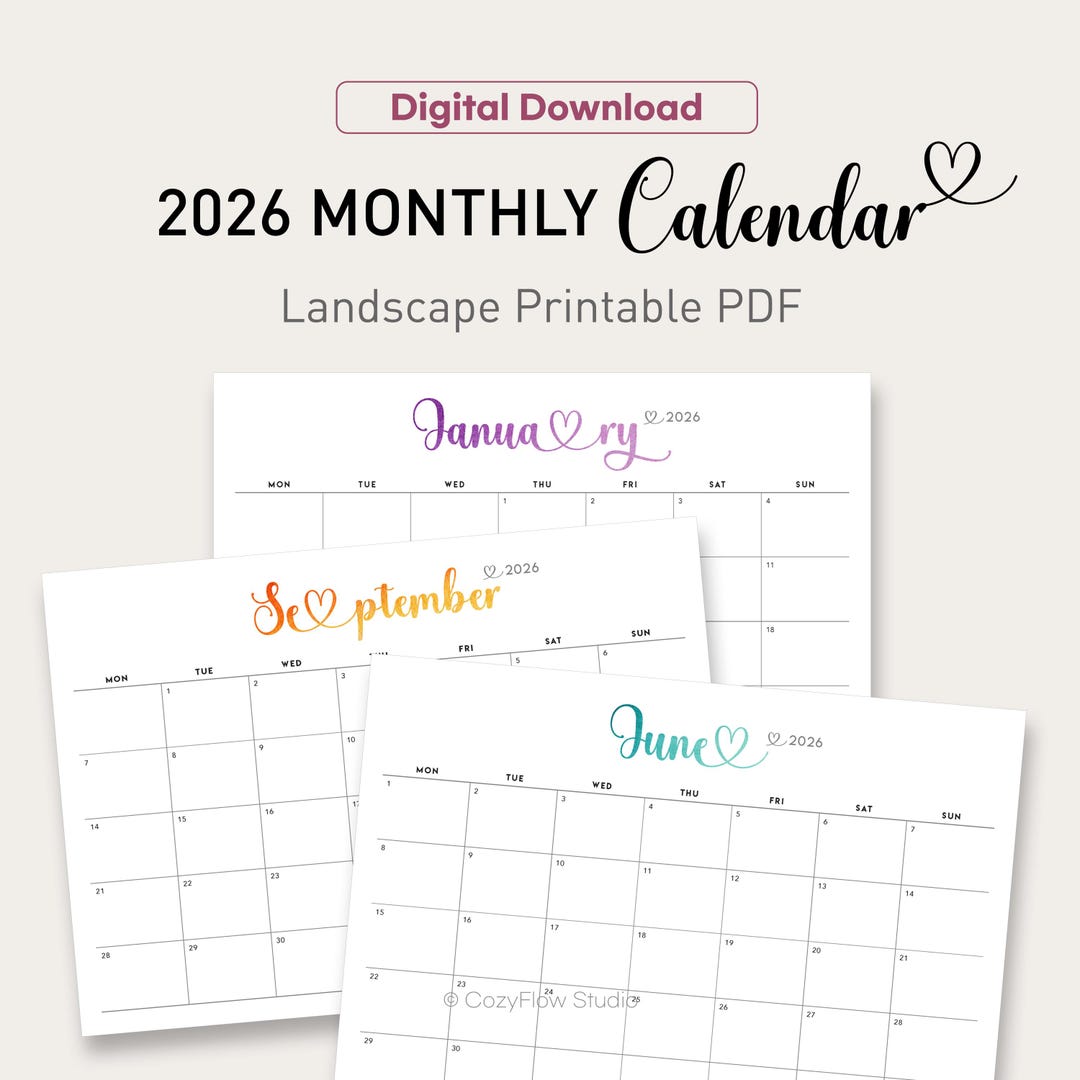 2026 Printable Watercolor Script Calendar Heart Lettering Monthly ...