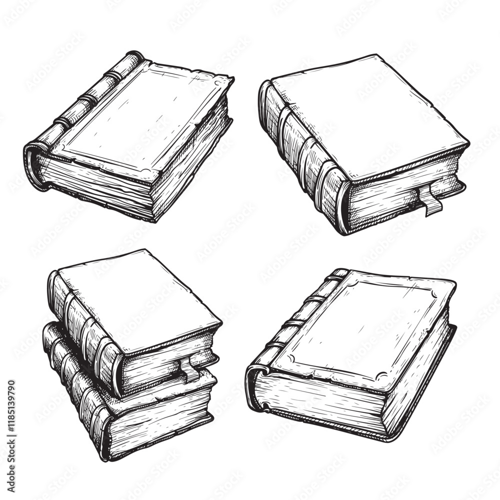 Hand drawn books sketch set. Vintage single and stack books. Education ...