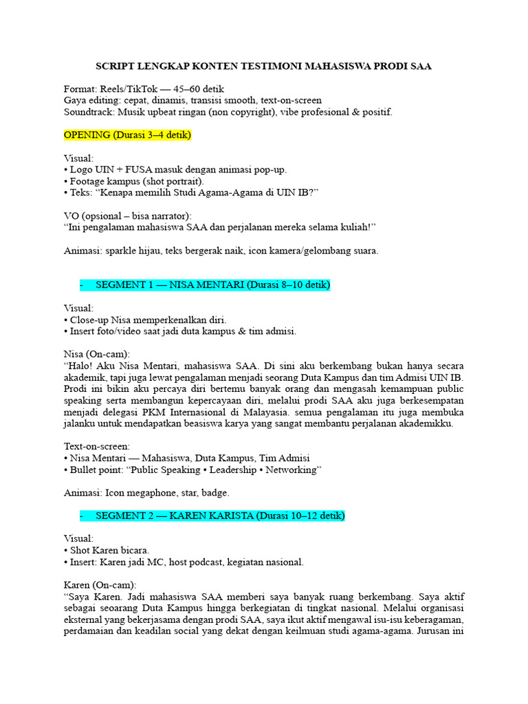 Script Lengkap Konten Testimoni Mahasiswa Prodi Saa | PDF