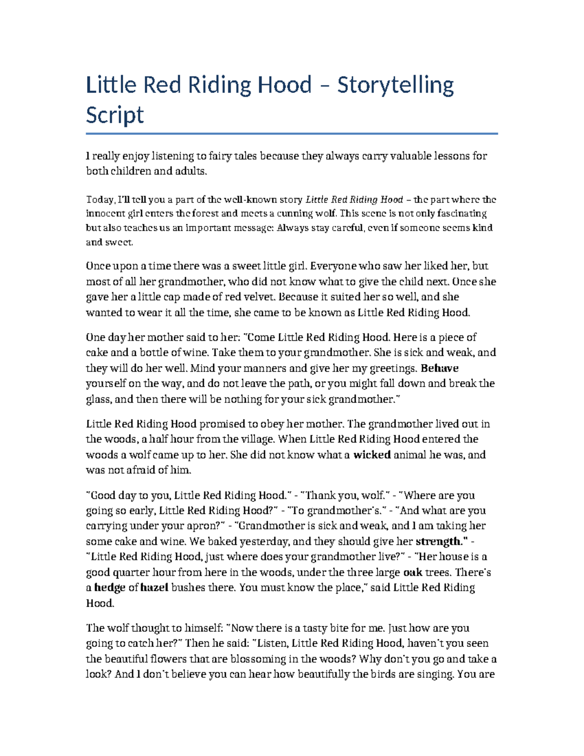 Little Red Riding Hood Storytelling Script: A Cautionary Tale - Studocu