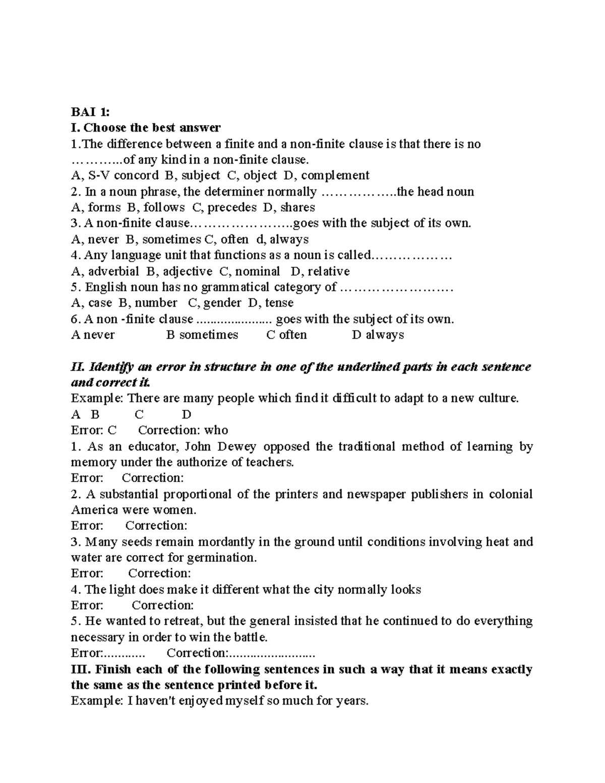 Bài ôn tập 1 - sdfb - BAI 1: I. Choose the best answer 1 difference ...