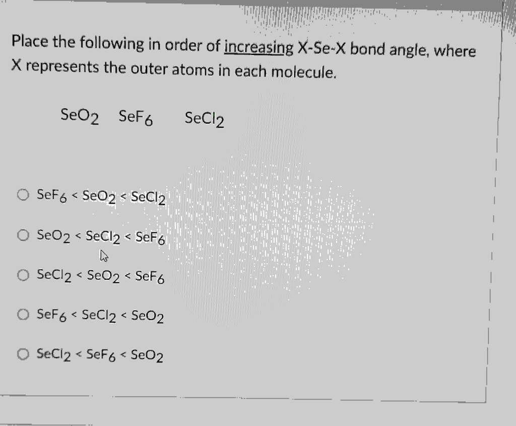SOLVED: Place the following in order of increasing X-Se-X bond angle ...