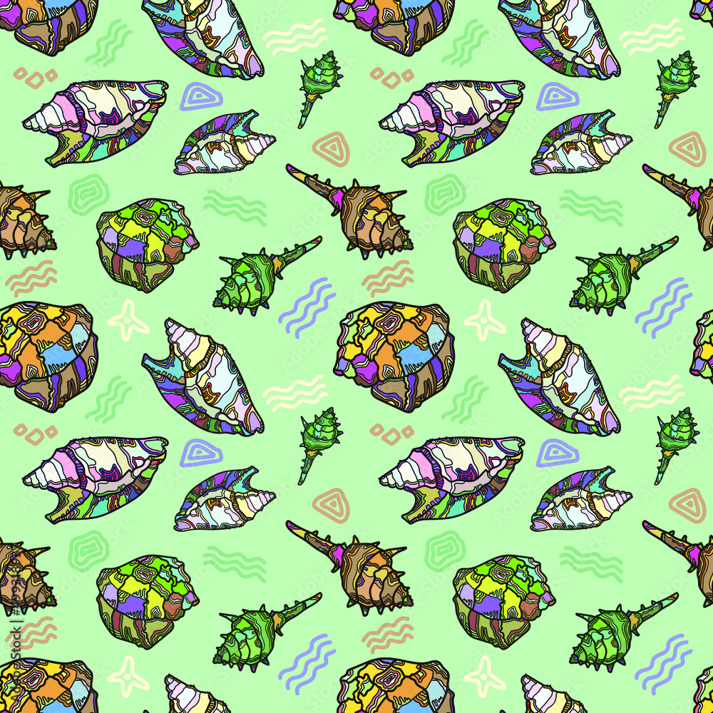 Marine seamless vector pattern with sea shells. Seashell spiral drawing ...