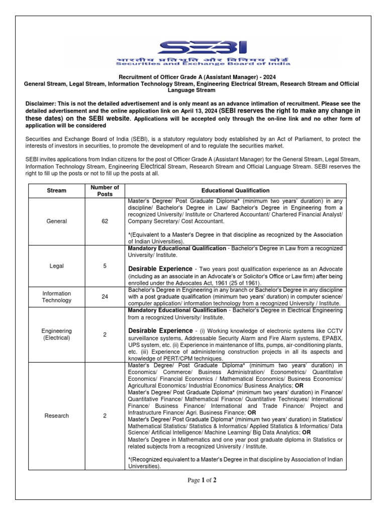 SEBI Grade A Recruitment 2024 Notification For Assistant Manager सेबी ...
