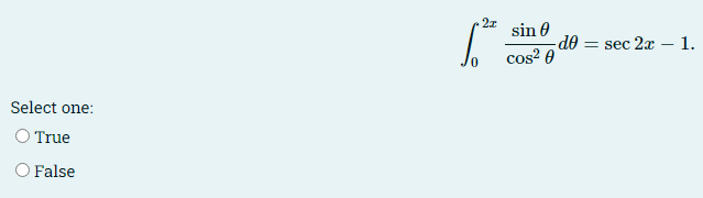 Solved ∫02xcos2θsinθdθ=sec2x−1 Select one: True False | Chegg.com