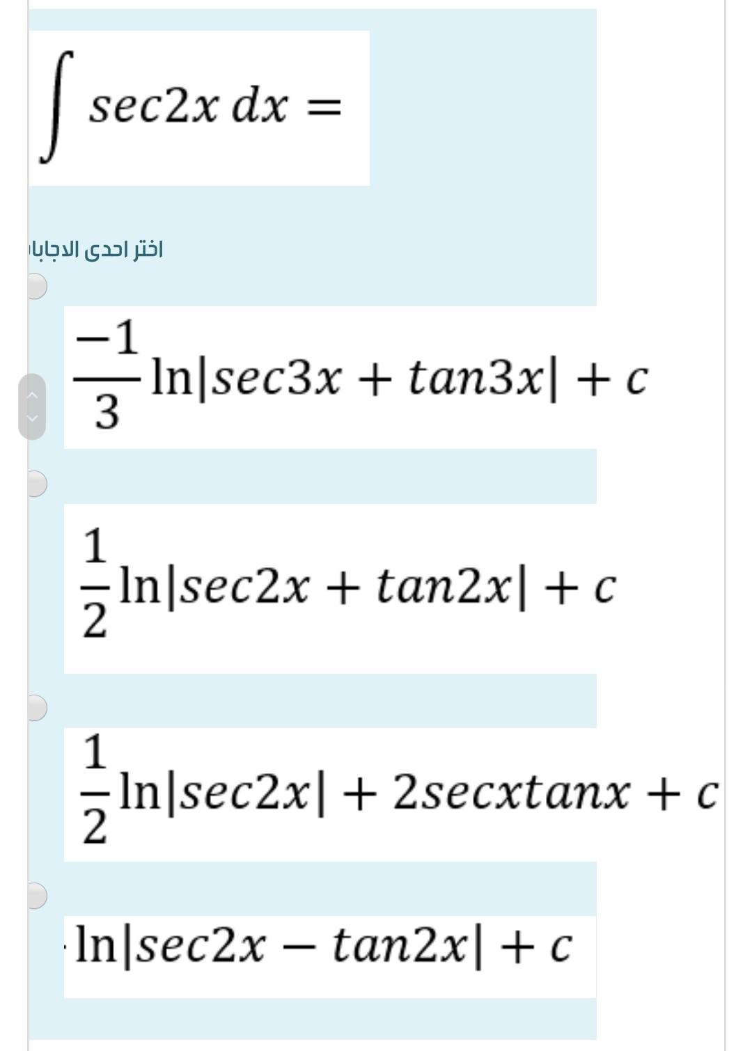 Solved sec2x dx = اختر احدي الدجابا -1 In sec3x + tan3x] + 0 | Chegg.com