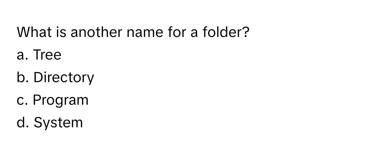 Solved: What is another name for a folder? a. Tree b. Directory c ...