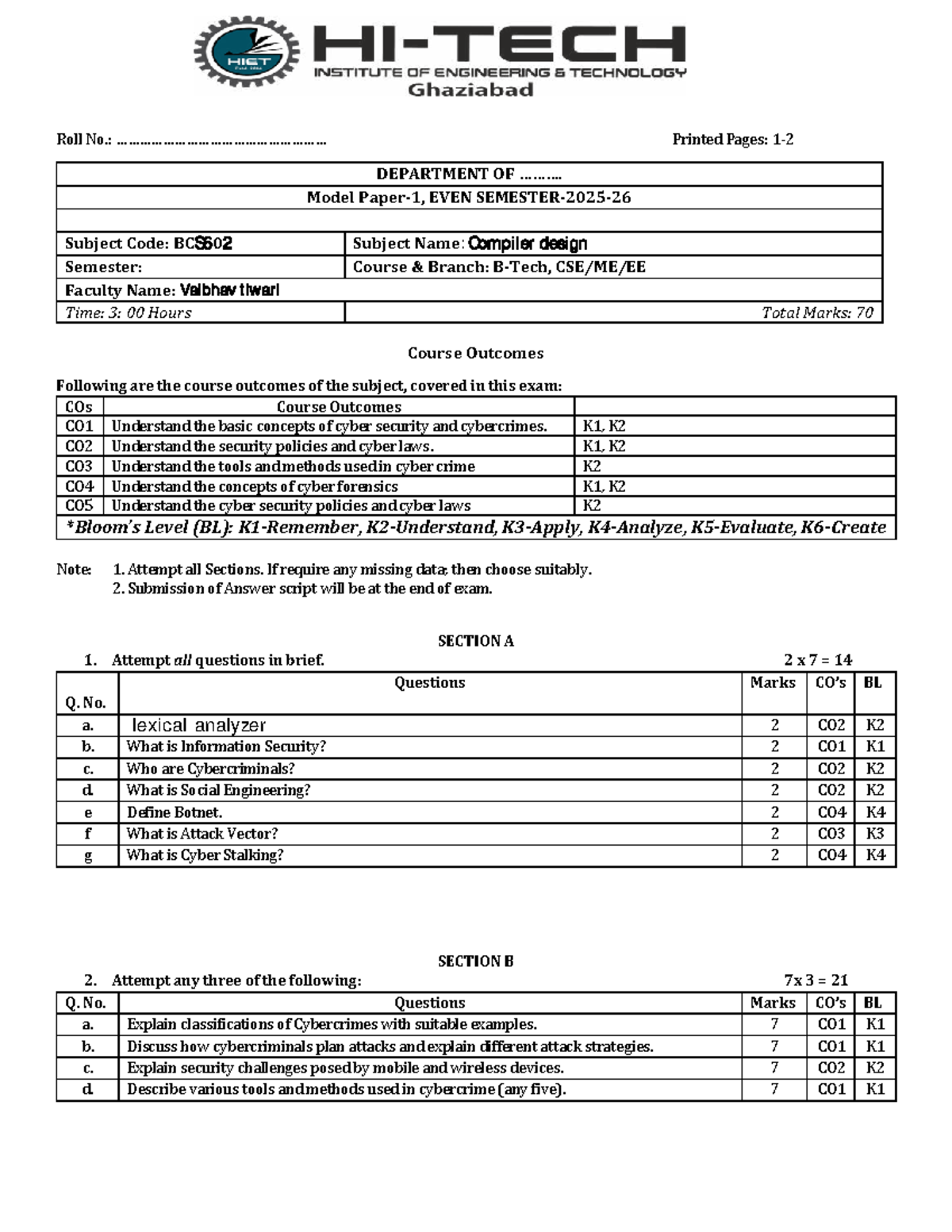 BCS602: Compiler Design Exam - Cyber Security Concepts and Outcomes ...