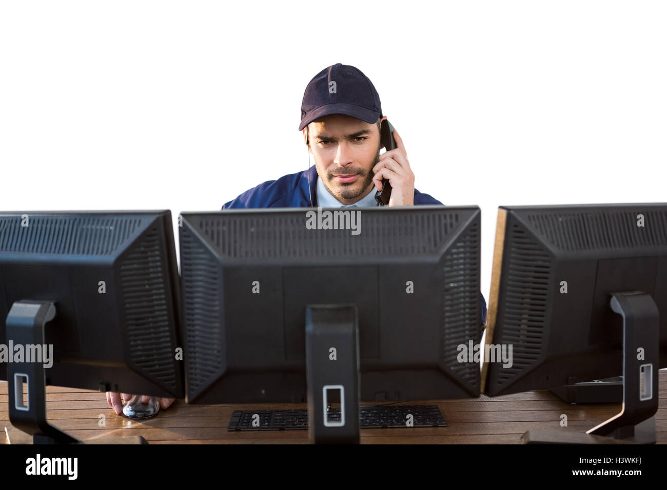 Security officer talking on phone while using computer Stock Photo - Alamy