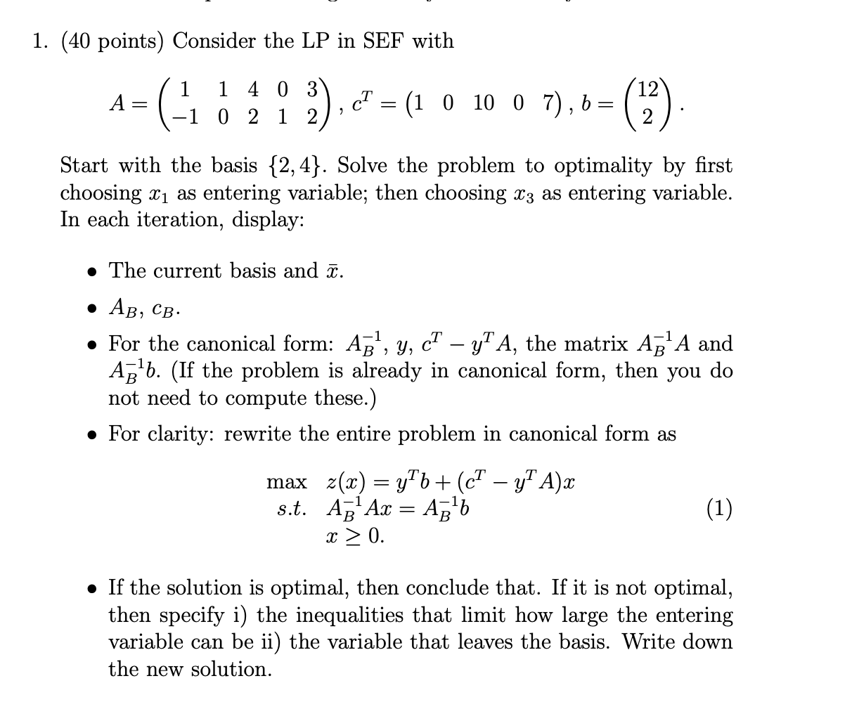 Solved 1. (40 points) Consider the LP in SEF with A = - (+1 | Chegg.com