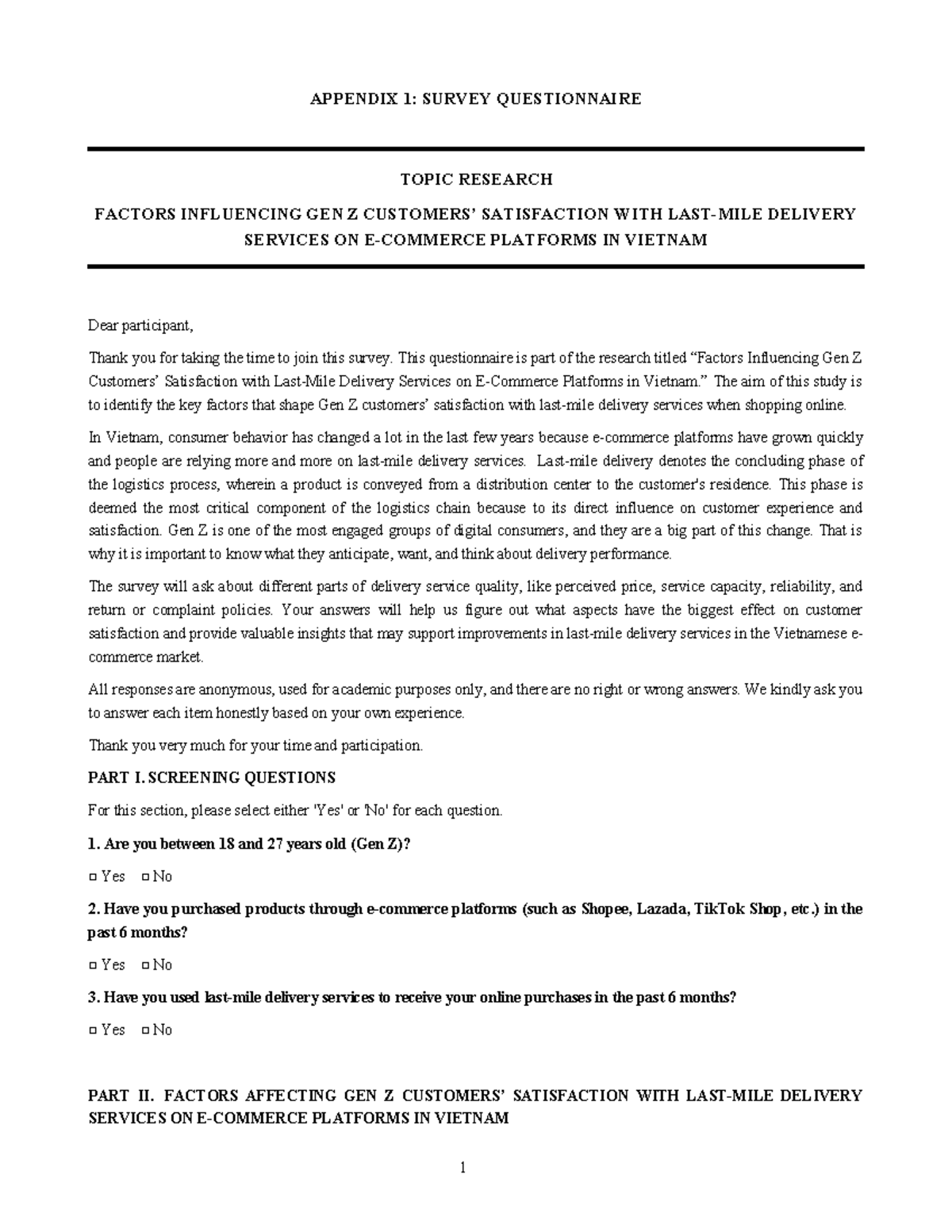 APPENDIX 1: SURVEY QUESTIONNAIRE ON GEN Z SATISFACTION WITH DELIVERY ...