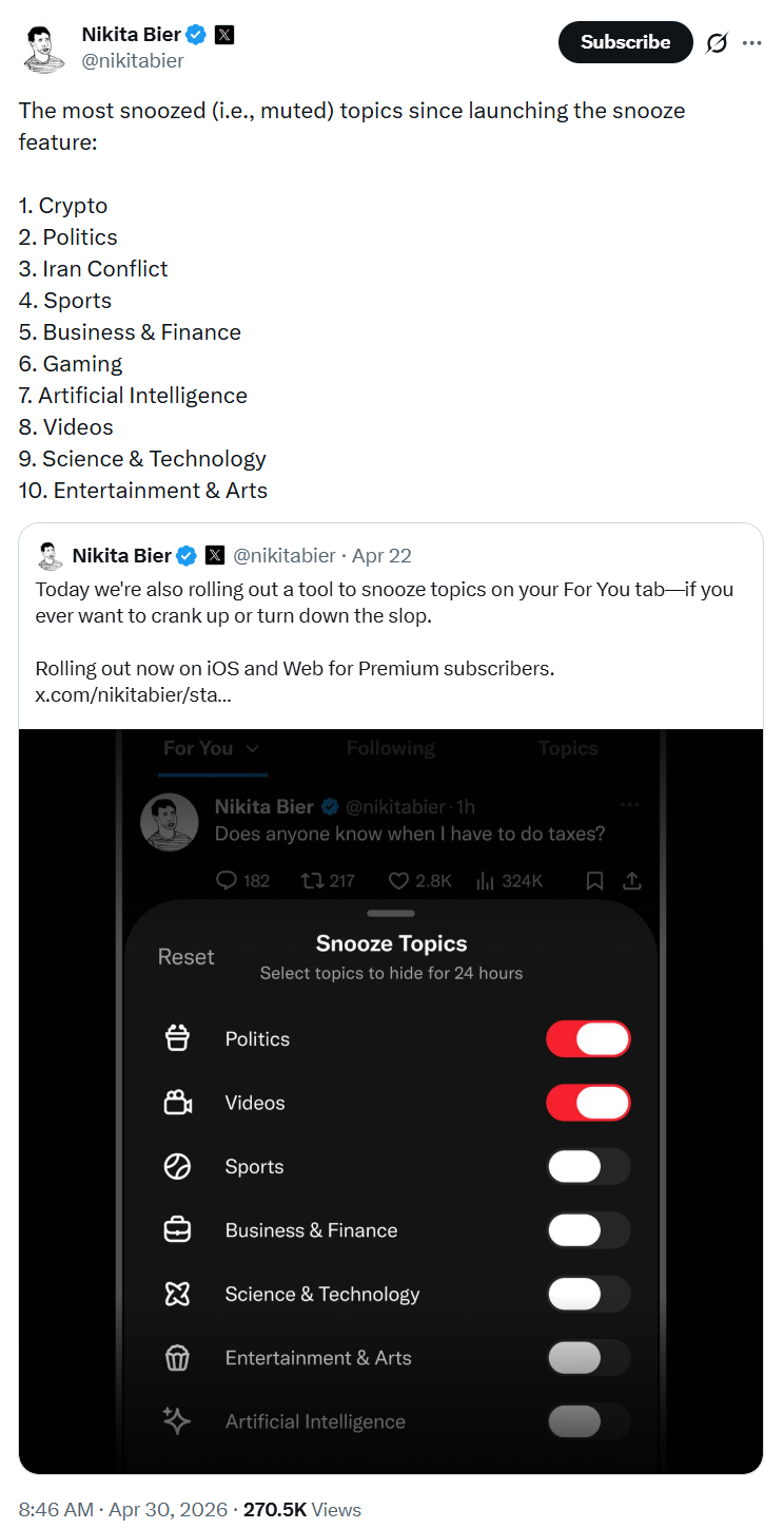 Crypto becomes most muted topic on X, and AI slop may be the culprit