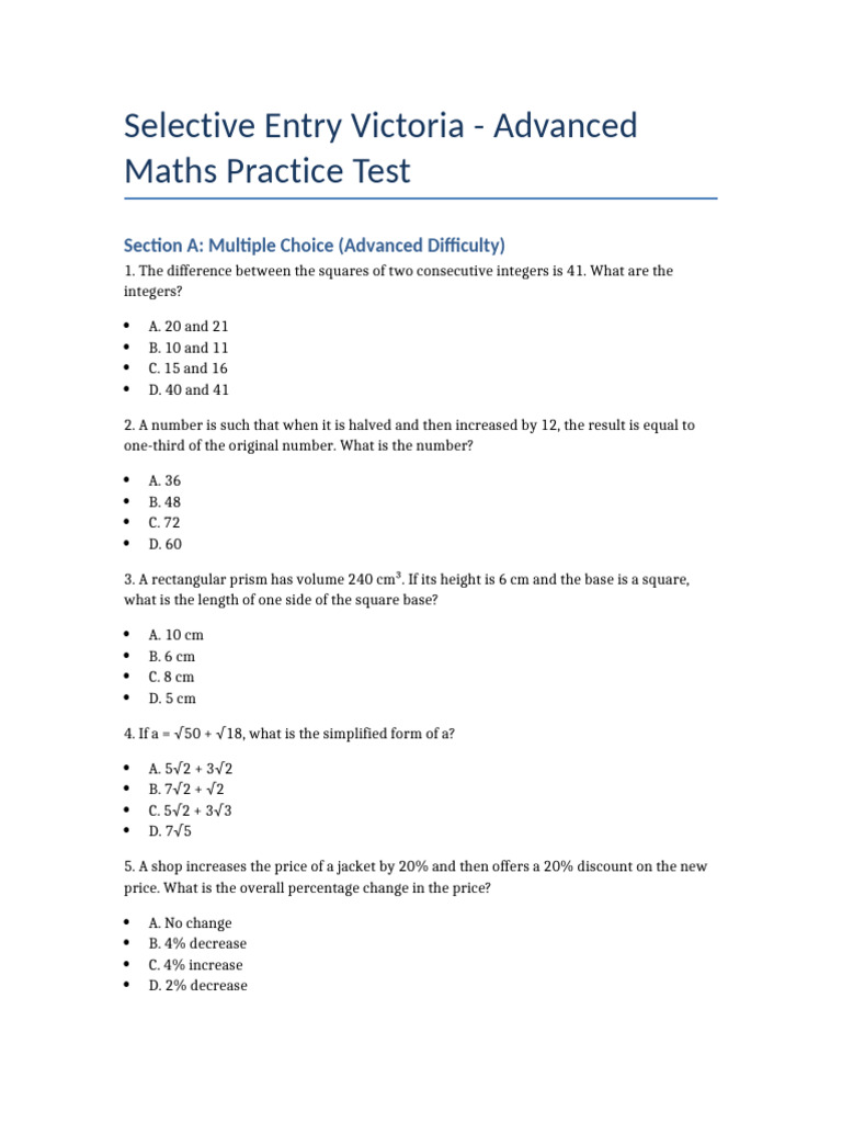 Selective Entrance Test Sample: Solve Math Questions for Year 6 ...