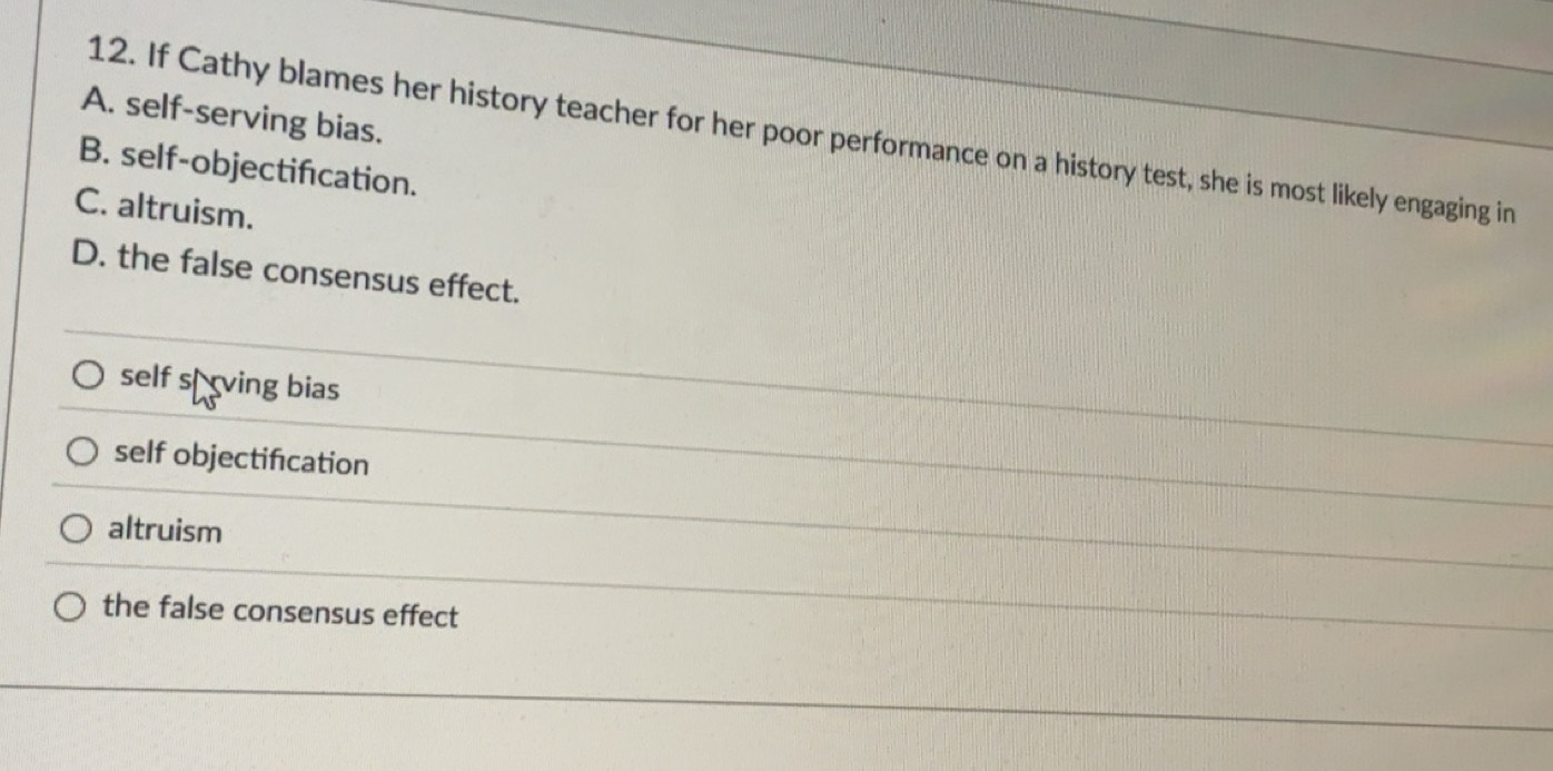 Solved: A. self-serving bias. 12. If Cathy blames her history teacher ...