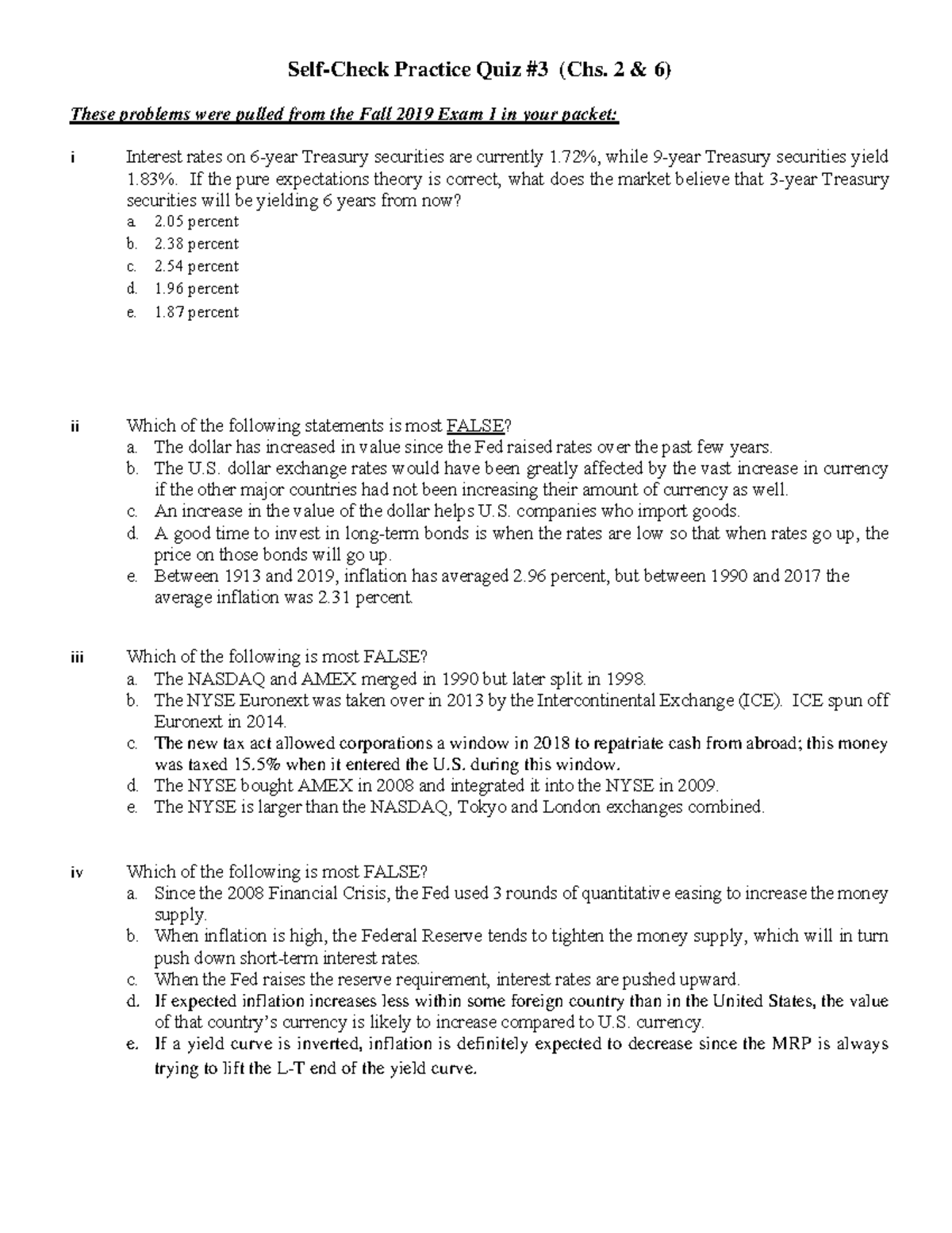 Self-check quiz #3 (Ch. 2 & 6) with practice problems from Fall 2019 ...