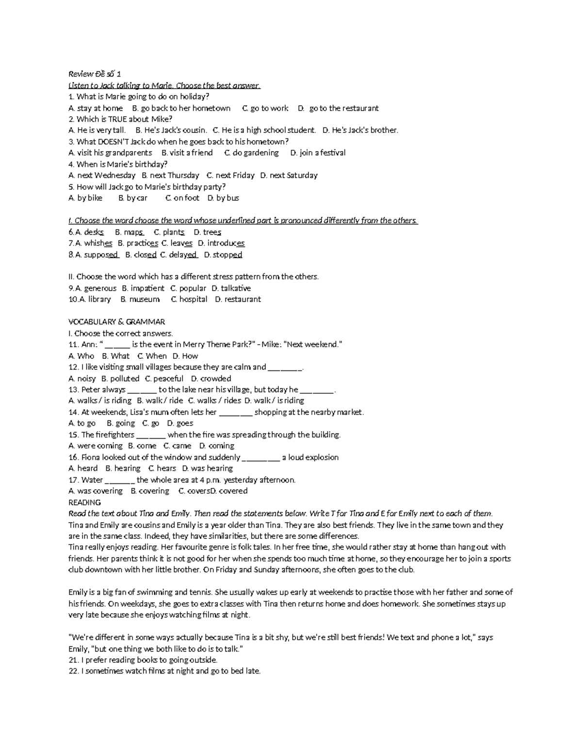 Đề số 1: Listening Practice for Hạnh Lớp 8 - Self-Study Guide - Studocu