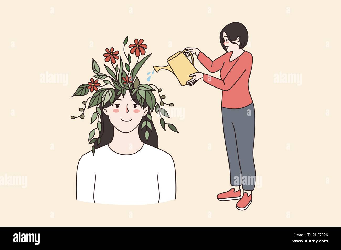 Personal growth concept. Girl with watering can waters brain, abstract ...