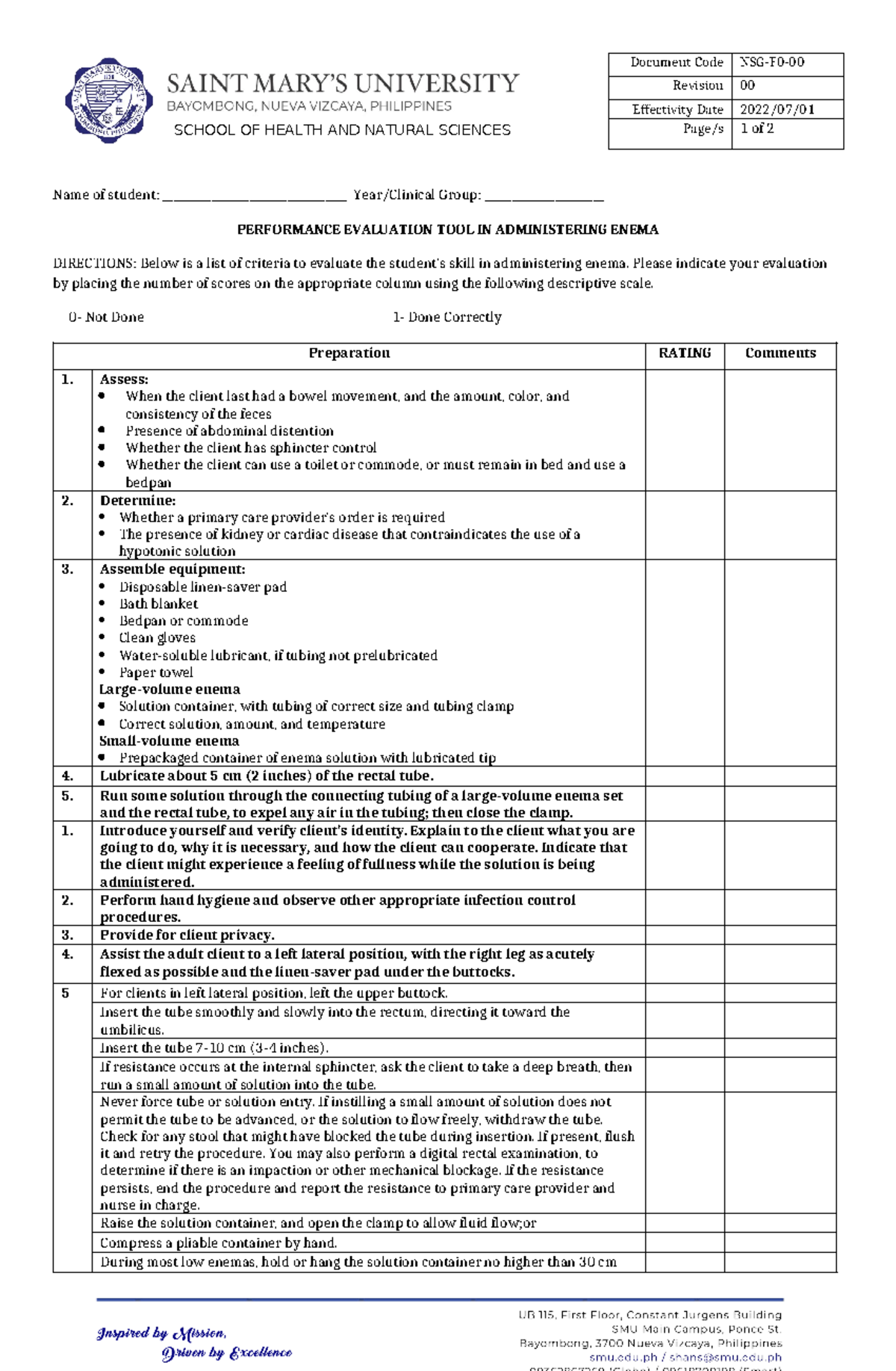 ISO-Enema - checklist for enema 2nd sem - SCHOOL OF HEALTH AND NATURAL ...