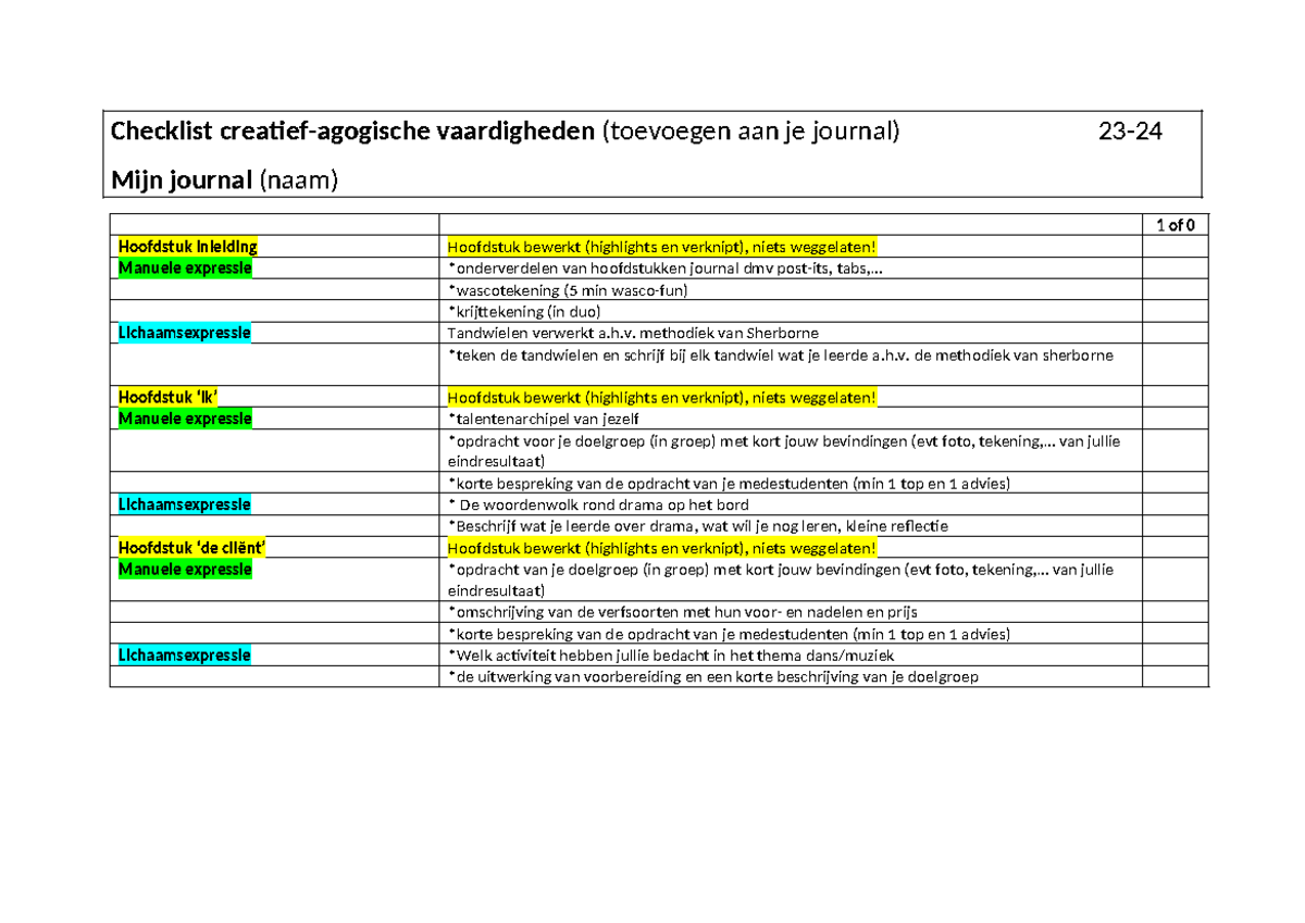Checklist journal creatief-agogische vaardigheden (sem 2) - Checklist ...