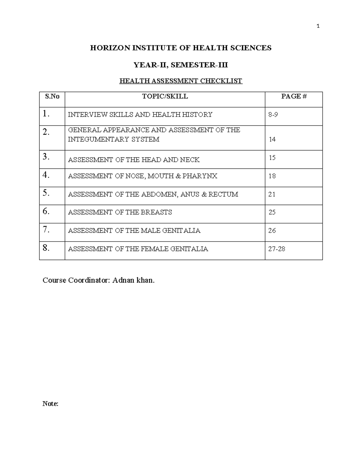 Health Assessment Checklist for 3rd Sem Nursing Students - Studocu