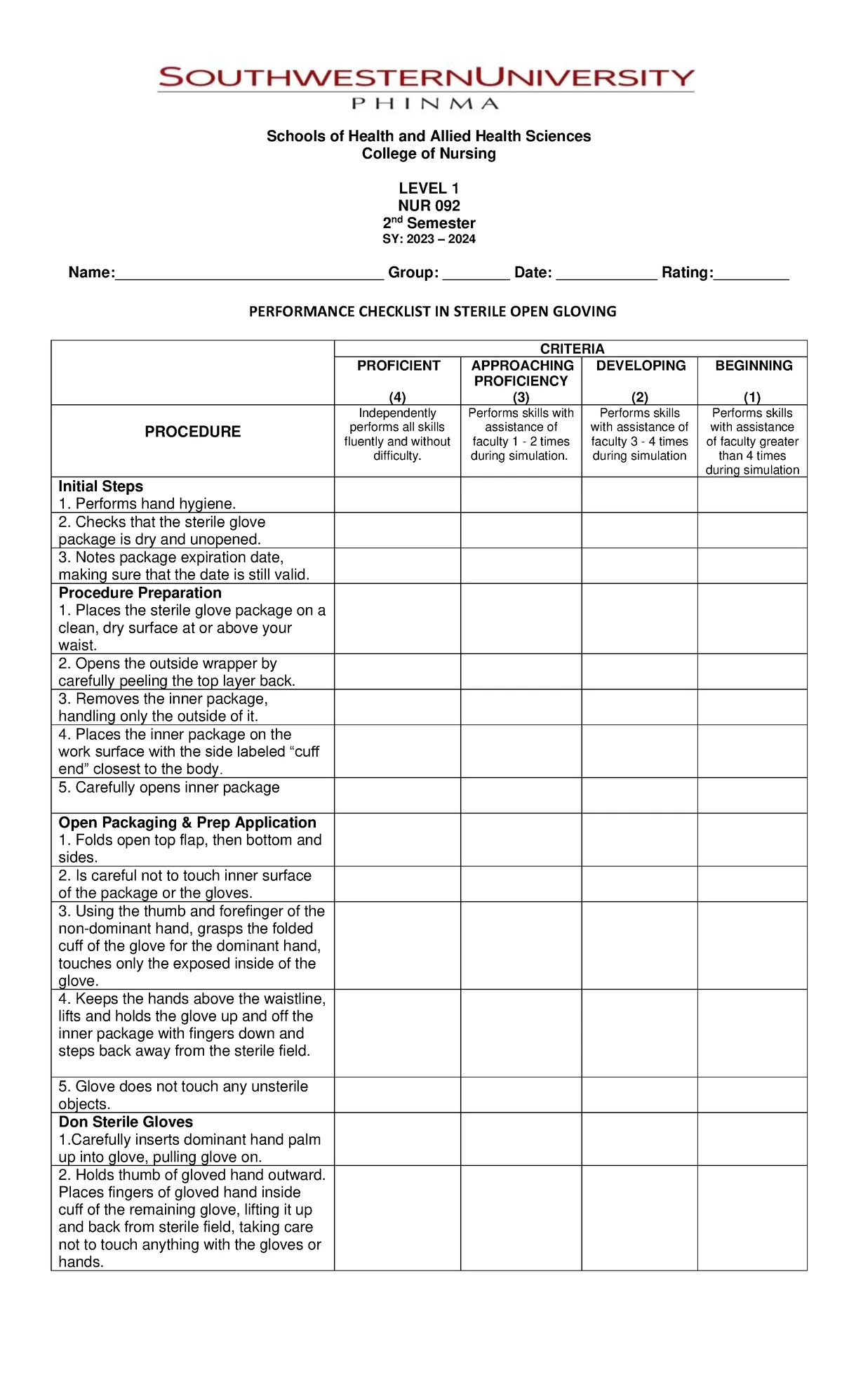 NUR 098 - 2nd Sem Handwashing Performance Checklist (SY 2023-2024 ...