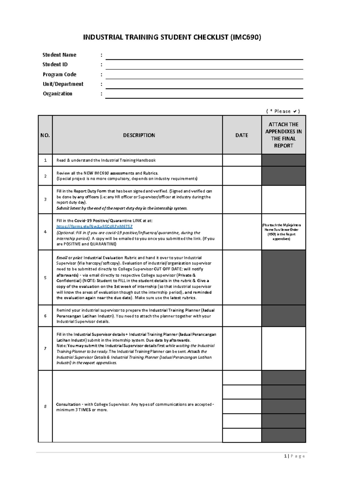 IMC690 Industrial Training Student Checklist for Sem 20252 - Studocu