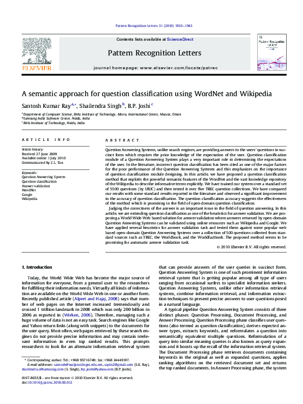(PDF) Question Classification - A Semantic Approach using WordNet and ...