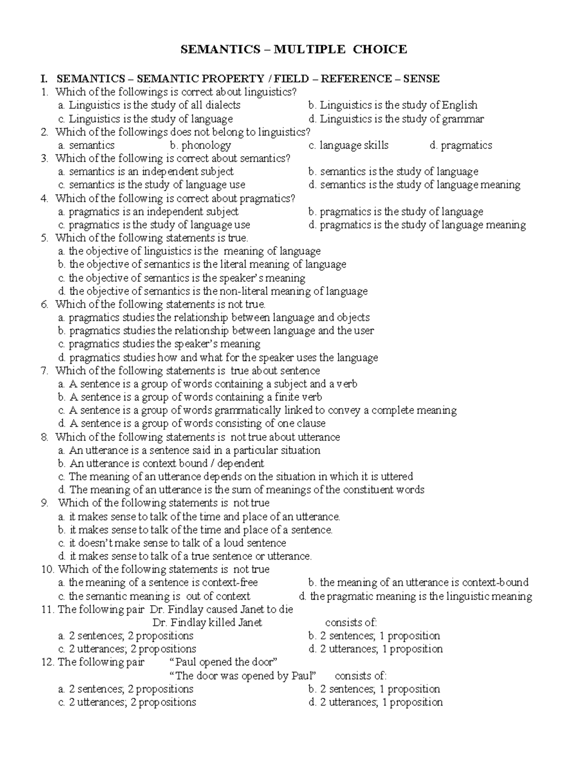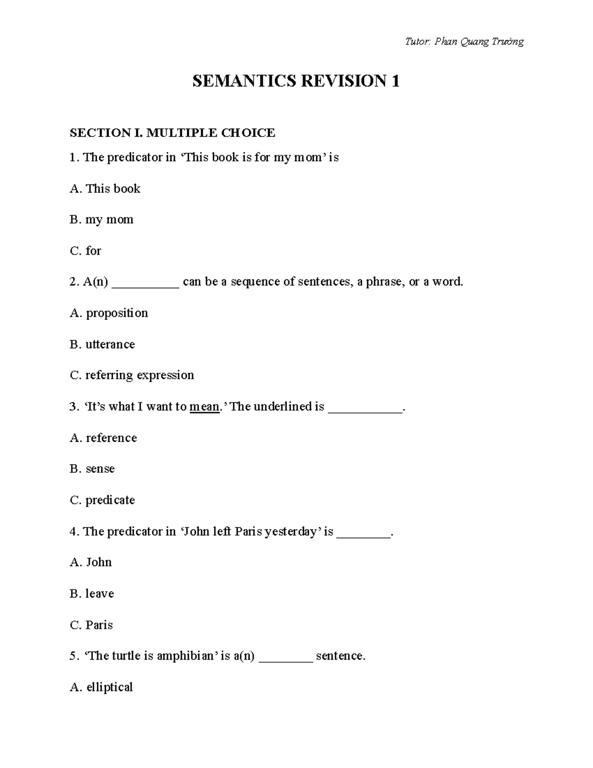 Semantics Review 1: Multiple Choice Questions and Answers - Studocu